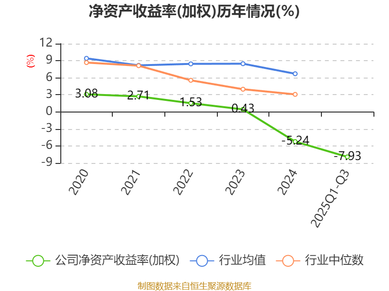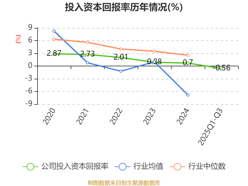 盈利能力方面, 2025年前三季度公司加权平均净资产收益率为-7.93%,同比下降7.3个百分点。公司2025年前三季度投入资本回报率为-0.56%,较上年同期下降2.09个百分点。