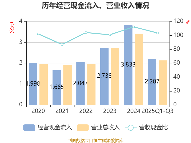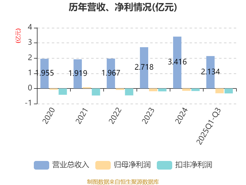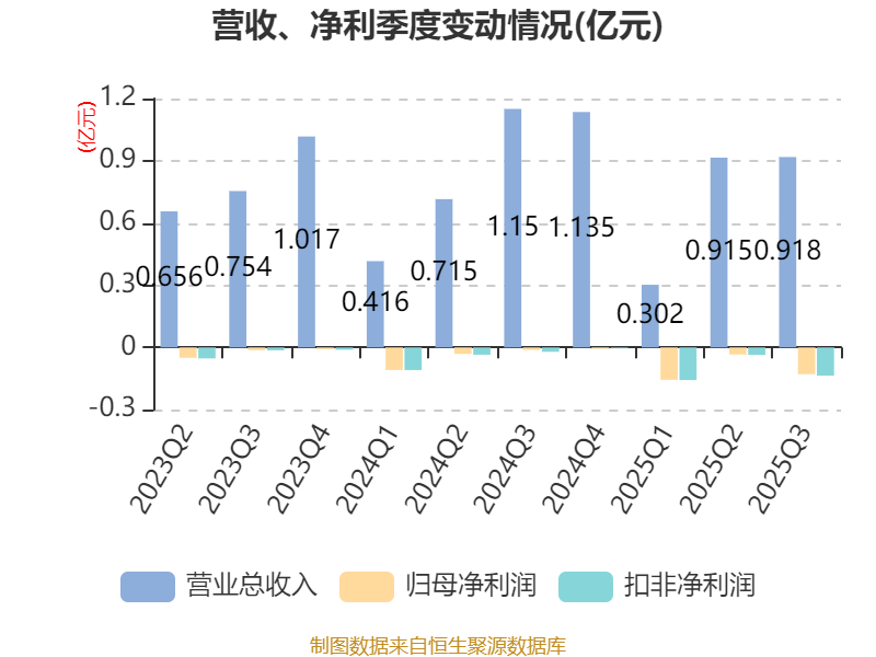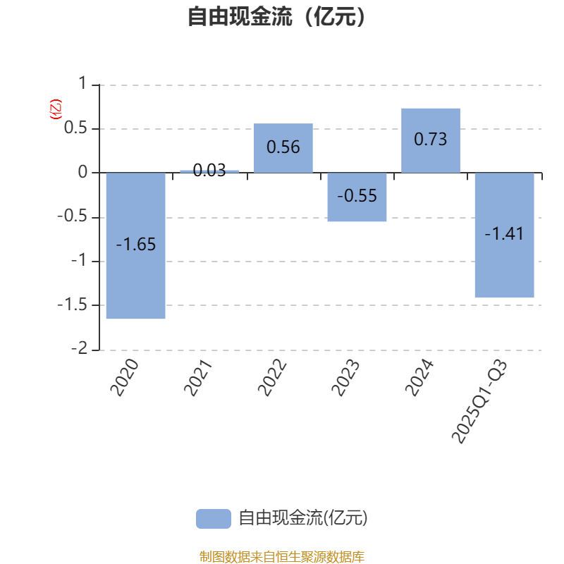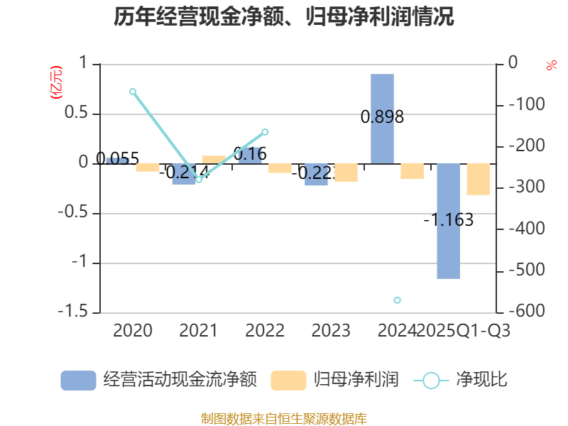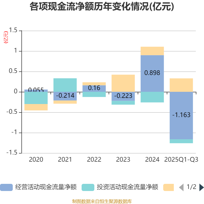 2025年前三季度,公司经营活动现金流净额为-1.16亿元,同比减少1.18亿元;筹资活动现金流净额3294.22万元,同比减少647.15万元;投资活动现金流净额-968.08万元,上年同期为-853.16万元。