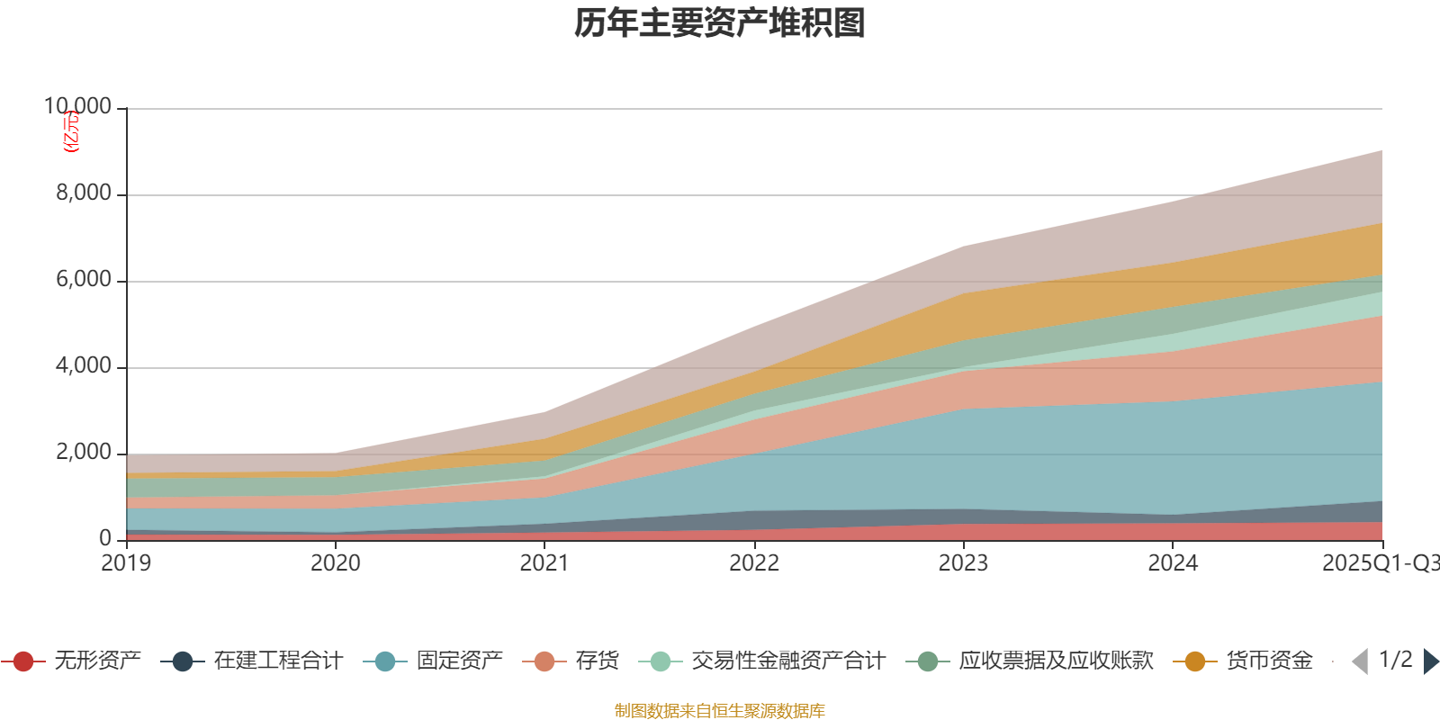 资产重大变化方面,截至2025年三季度末,公司应收票据及应收账款较上年末减少36.81%,占公司总资产比重下降3.59个百分点;固定资产较上年末增加5.24%,占公司总资产比重下降2.88个百分点;在建工程合计较上年末增加144.51%,占公司总资产比重上升2.86个百分点;存货较上年末增加31.83%,占公司总资产比重上升2.15个百分点。