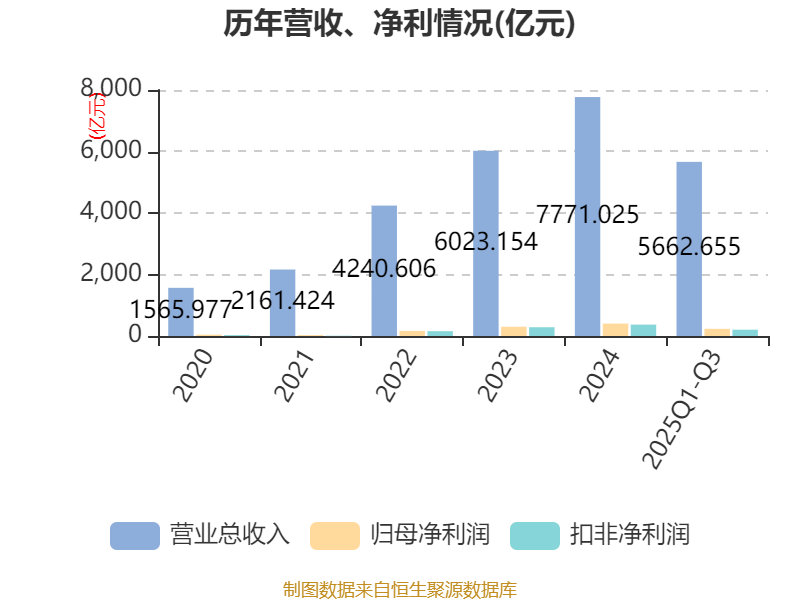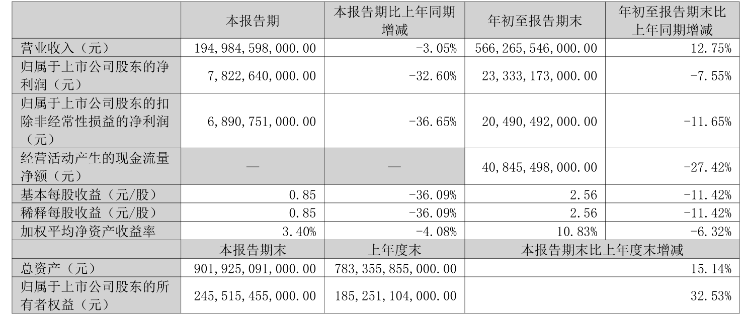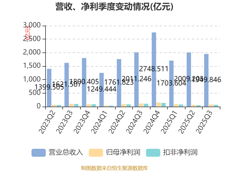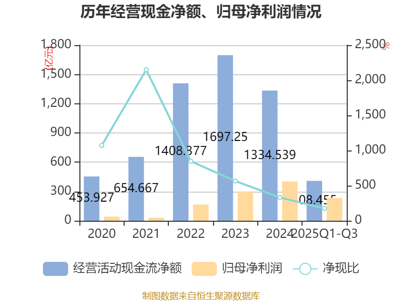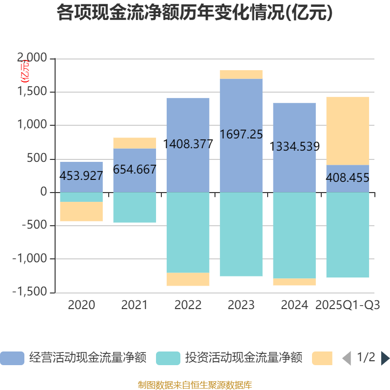 2025年前三季度,公司经营活动现金流净额为408.45亿元,同比下降27.42%;筹资活动现金流净额1016.63亿元,同比增加1136.24亿元;投资活动现金流净额-1275.71亿元,上年同期为-866.51亿元。
