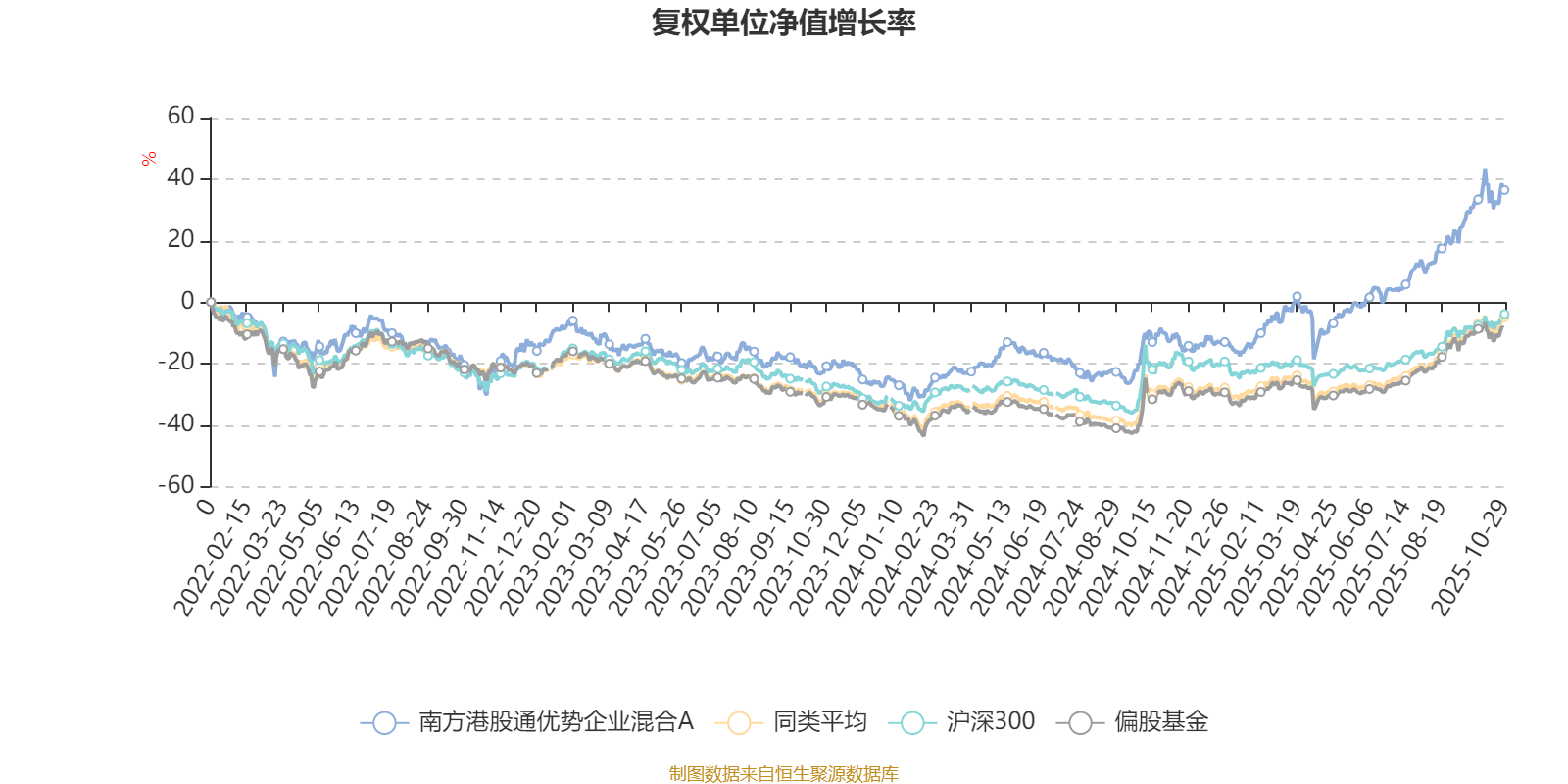 截至10月29日,南方港股通优势企业混合A近三个月复权单位净值增长率为19.86%,位于同类可比基金48/130;近半年复权单位净值增长率为43.46%,位于同类可比基金30/130;近一年复权单位净值增长率为52.38%,位于同类可比基金24/130;近三年复权单位净值增长率为92.94%,位于同类可比基金3/124。