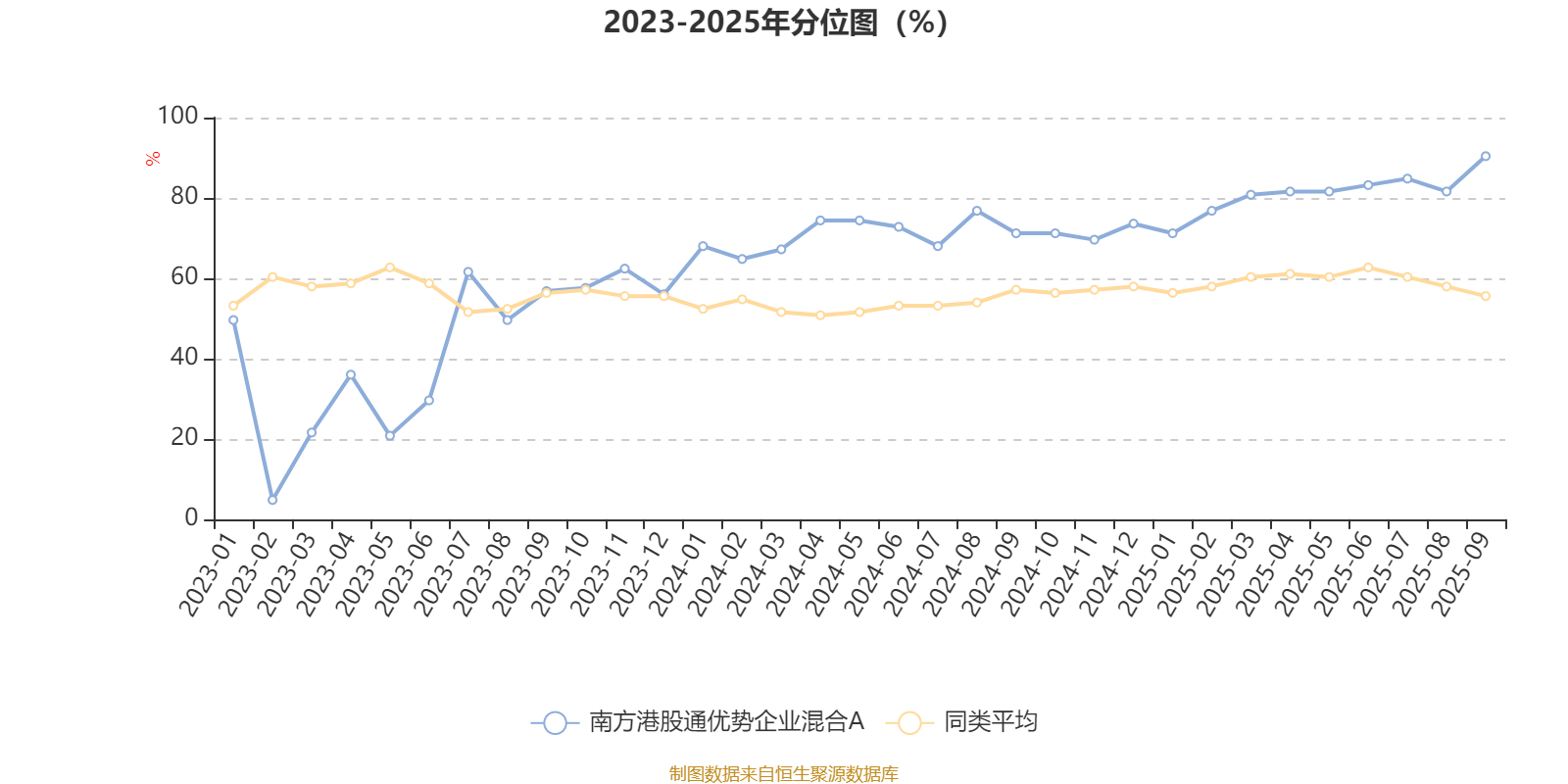 通过所选区间该基金净值增长率分位图,可以观察该基金与同类基金业绩比较情况。图为坐标原点到区间内某时点的净值增长率在同类基金中的分位数。