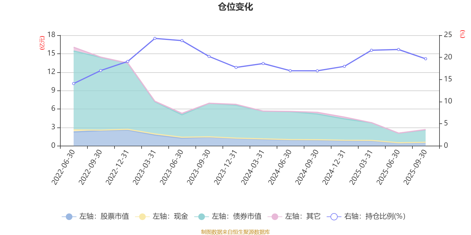 据定期报告数据统计,近三年平均股票仓位为19.89%,同类平均为19.14%。2023年一季度末基金达到24.29%的最高仓位,2022年上半年末最低,为14.08%。