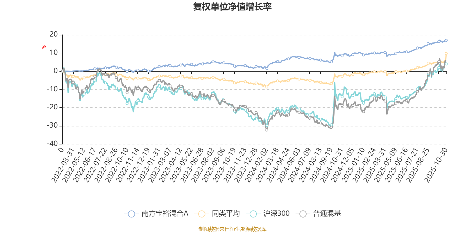 截至10月30日,南方宝裕混合A近三个月复权单位净值增长率为3.42%,位于同类可比基金221/629;近半年复权单位净值增长率为7.03%,位于同类可比基金216/629;近一年复权单位净值增长率为7.86%,位于同类可比基金277/623;近三年复权单位净值增长率为17.84%,位于同类可比基金126/557。