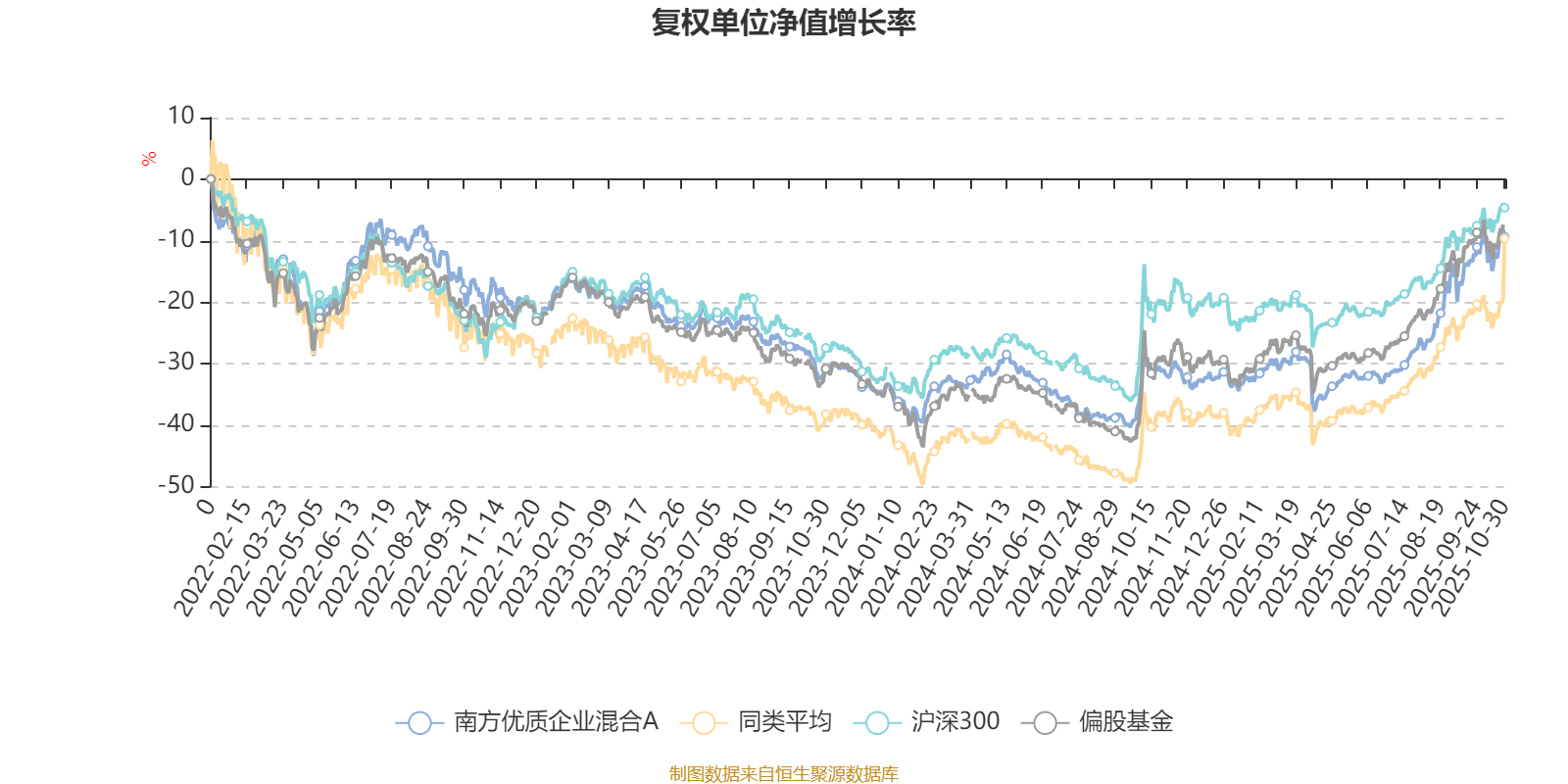 截至10月30日,南方优质企业混合A近三个月复权单位净值增长率为22.69%,位于同类可比基金160/621;近半年复权单位净值增长率为36.80%,位于同类可比基金200/621;近一年复权单位净值增长率为33.12%,位于同类可比基金275/611;近三年复权单位净值增长率为16.01%,位于同类可比基金277/518。