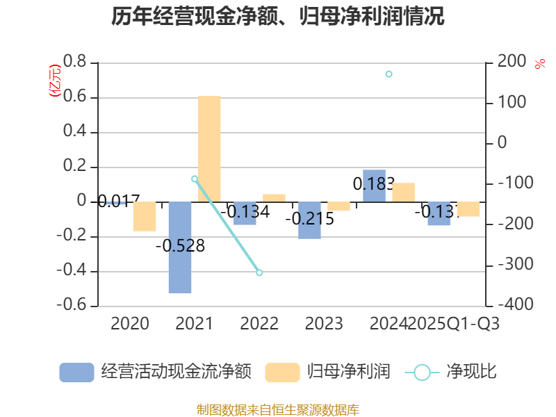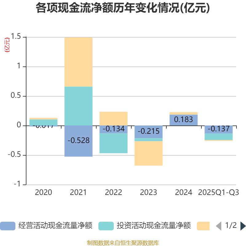 2025年前三季度,公司经营活动现金流净额为-1368.18万元,同比增加3037.55万元;筹资活动现金流净额-155.98万元,同比减少347.89万元;投资活动现金流净额-1086.91万元,上年同期为7378.04万元。