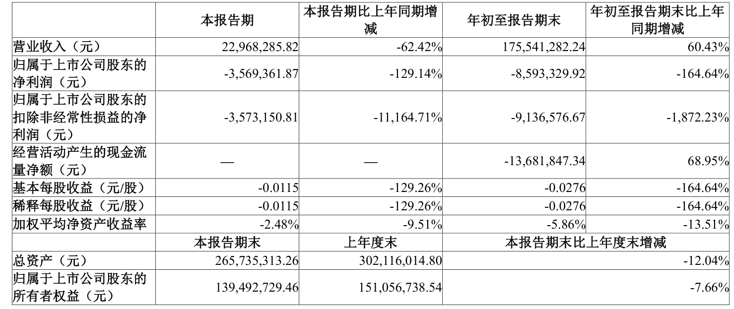 中证智能财讯 *ST万方(000638)10月31日披露2025年第三季度报告。前三季度公司实现营业总收入1.76亿元,同比增长60.43%;归母净利润亏损859.33万元,上年同期盈利1329.48万元;扣非净利润亏损913.66万元,上年同期盈利51.55万元;经营活动产生的现金流量净额为-1368.18万元,上年同期为-4405.73万元;报告期内,*ST万方基本每股收益为-0.0276元,加权平均净资产收益率为-5.86%。