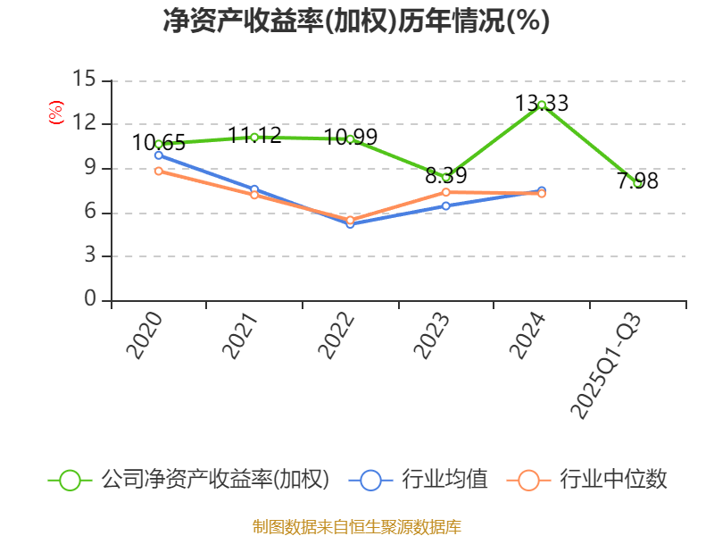 盈利能力方面, 2025年前三季度公司加权平均净资产收益率为7.98%,同比下降2.3个百分点。公司2025年前三季度投入资本回报率为5.66%,较上年同期下降1.07个百分点。