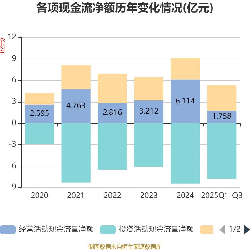 2025年前三季度,公司经营活动现金流净额为1.76亿元,同比下降66.47%;筹资活动现金流净额3.58亿元,同比增加5.76亿元;投资活动现金流净额-7.8亿元,上年同期为-4.9亿元。