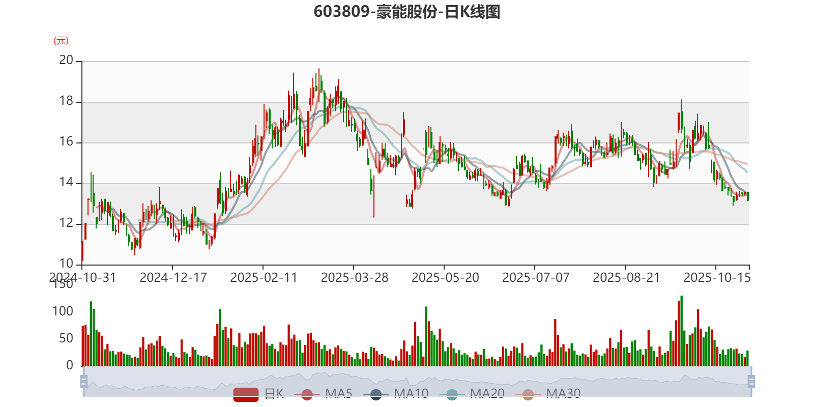 中证智能财讯豪能股份(603809)10月31日披露2025年第三季度报告。前三季度公司实现营业总收入18.95亿元,同比增长12.25%;归母净利润2.66亿元,同比增长9.11%;扣非净利润2.52亿元,同比增长8.56%;经营活动产生的现金流量净额为1.76亿元,同比下降66.47%;报告期内,豪能股份基本每股收益为0.3139元,加权平均净资产收益率为7.98%。