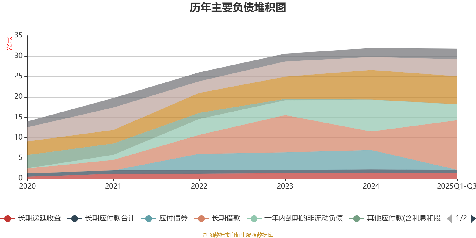 负债重大变化方面,截至2025年三季度末,公司长期借款较上年末增加168.84%,占公司总资产比重上升10.5个百分点;应付债券较上年末减少99.73%,占公司总资产比重下降7.6个百分点;一年内到期的非流动负债较上年末减少49.92%,占公司总资产比重下降6.82个百分点;应付票据及应付账款较上年末减少5.45%,占公司总资产比重下降1.62个百分点。