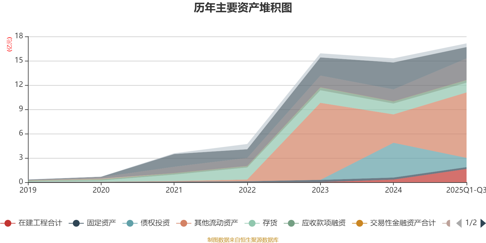 资产重大变化方面,截至2025年三季度末,公司其他流动资产较上年末增加130.15%,占公司总资产比重上升24.19个百分点;债权投资较上年末减少73.41%,占公司总资产比重下降21.38个百分点;货币资金较上年末减少57.93%,占公司总资产比重下降13.54个百分点;在建工程合计较上年末增加402.13%,占公司总资产比重上升7.42个百分点。