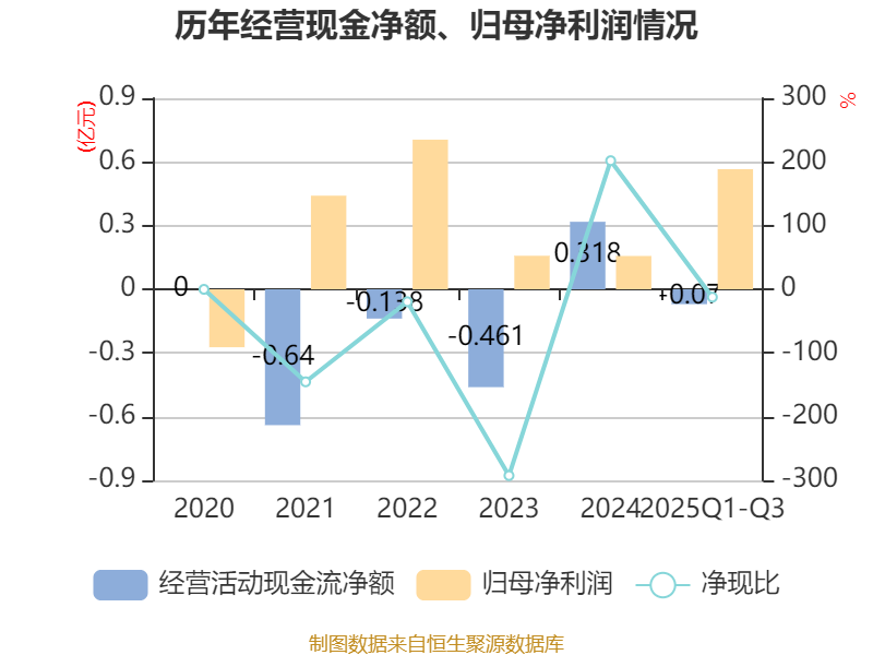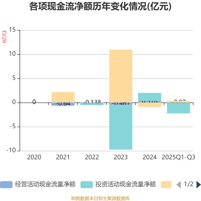 2025年前三季度,公司经营活动现金流净额为-701.74万元,同比减少606.25万元;筹资活动现金流净额3378.43万元,同比增加1.24亿元;投资活动现金流净额-2.19亿元,上年同期为2.67亿元。
