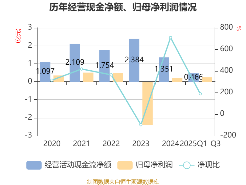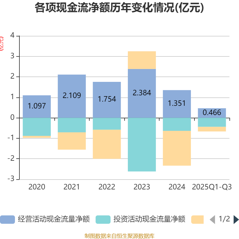 2025年前三季度,公司经营活动现金流净额为4660.62万元,同比下降63.7%;筹资活动现金流净额-2263.86万元,同比增加1.61亿元;投资活动现金流净额-4414.68万元,上年同期为-4201.86万元。