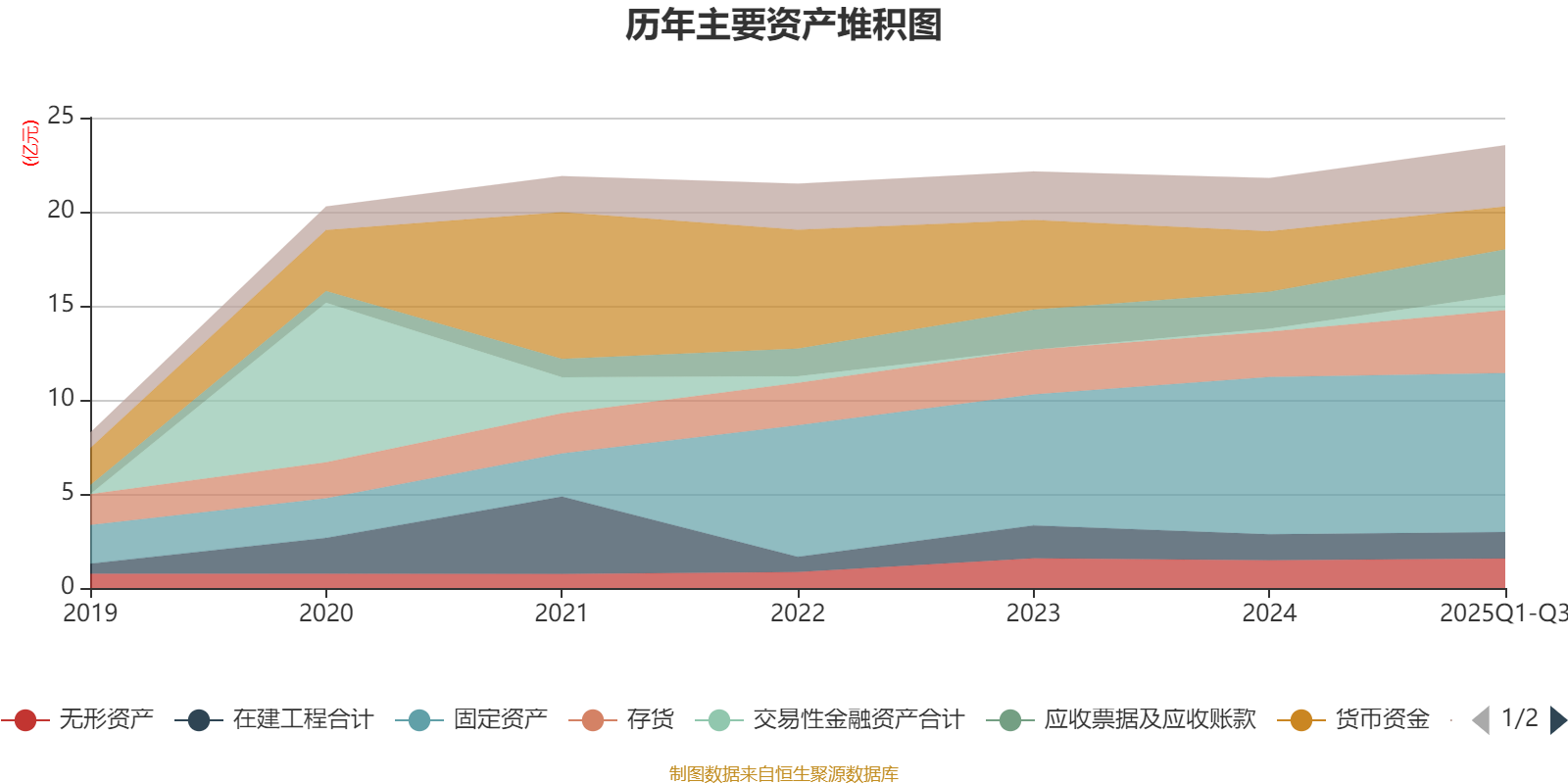 资产重大变化方面,截至2025年三季度末,公司货币资金较上年末减少29.06%,占公司总资产比重下降5.05个百分点;存货较上年末增加39.03%,占公司总资产比重上升3.17个百分点;交易性金融资产合计较上年末增加446.63%,占公司总资产比重上升2.8个百分点;固定资产较上年末增加1.07%,占公司总资产比重下降2.46个百分点。