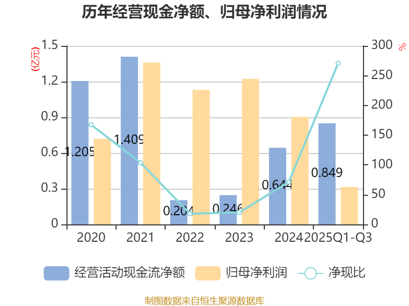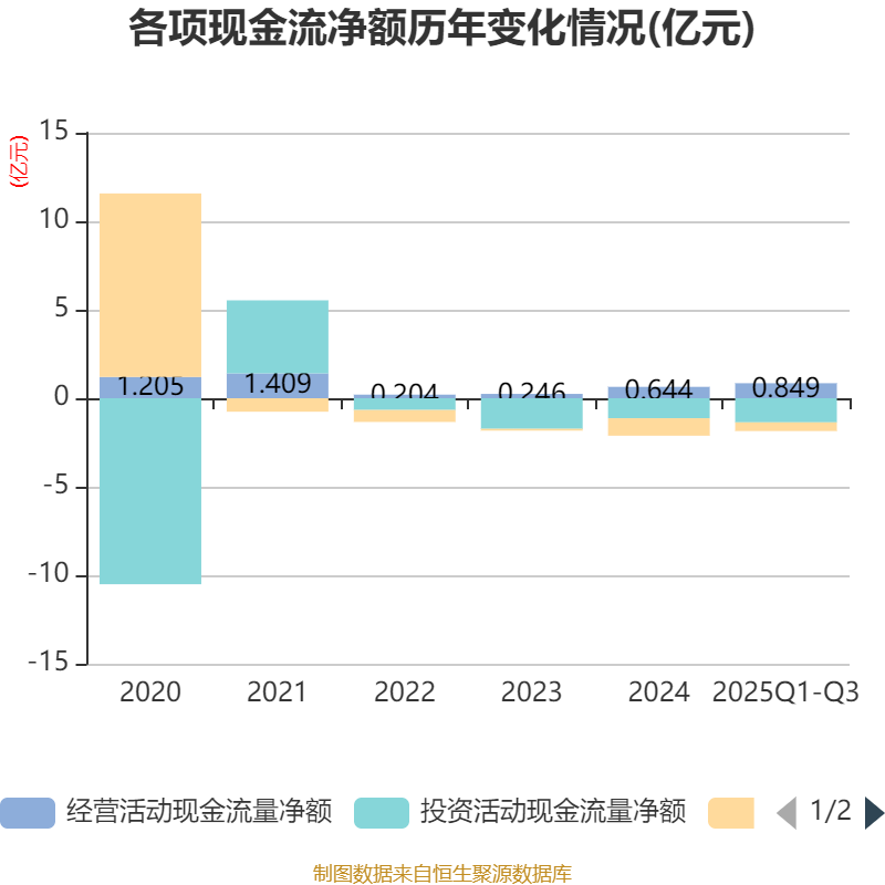 2025年前三季度,公司经营活动现金流净额为8493.06万元,同比增加1.12亿元;筹资活动现金流净额-4904.78万元,同比增加8111.38万元;投资活动现金流净额-1.36亿元,上年同期为-1.85亿元。