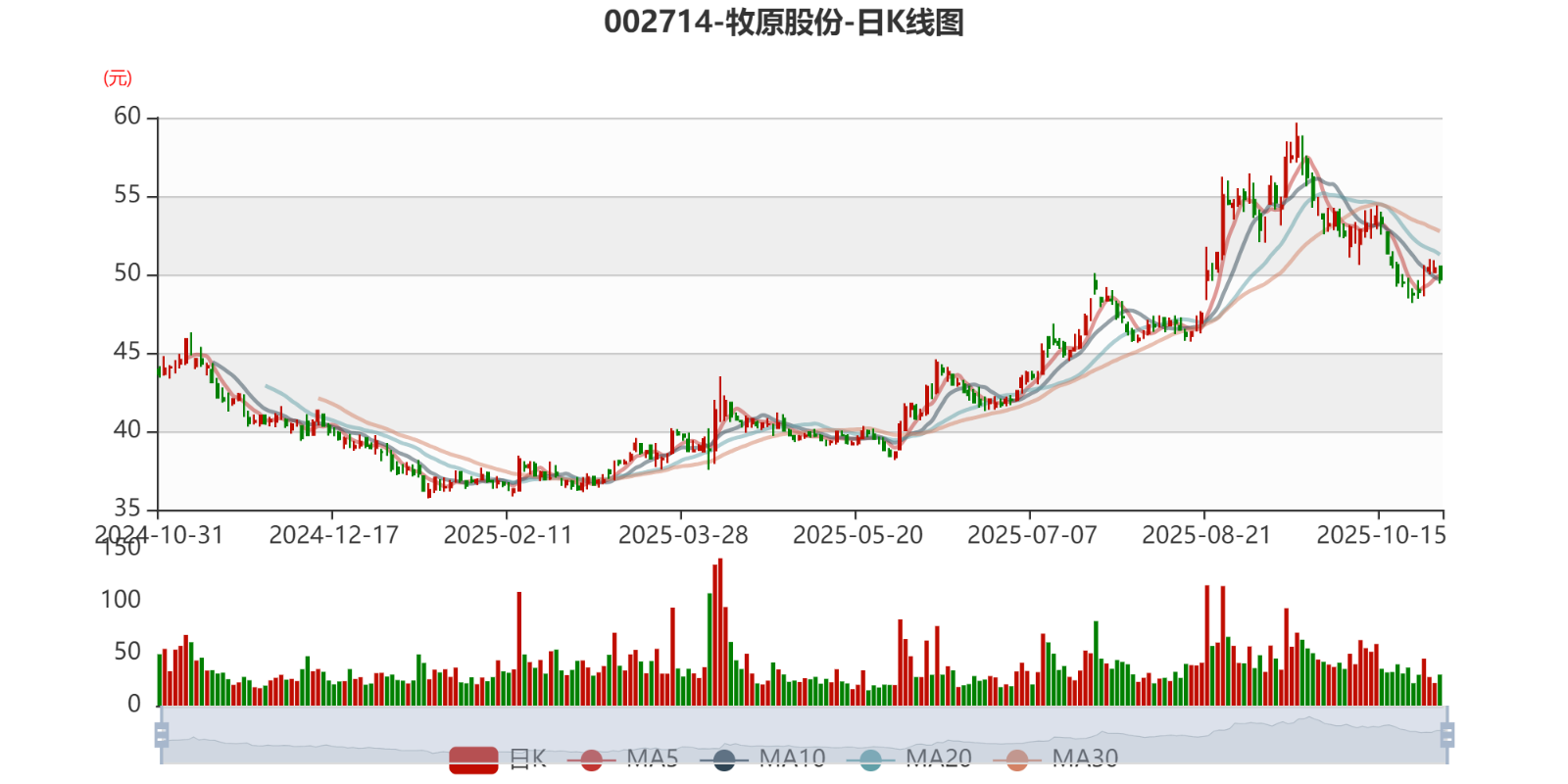 中证智能财讯牧原股份(002714)10月31日披露2025年第三季度报告。前三季度公司实现营业总收入1117.9亿元,同比增长15.52%;归母净利润147.79亿元,同比增长41.01%;扣非净利润154.73亿元,同比增长37.90%;经营活动产生的现金流量净额为285.8亿元,同比下降2.05%;报告期内,牧原股份基本每股收益为2.74元,加权平均净资产收益率为19.26%。