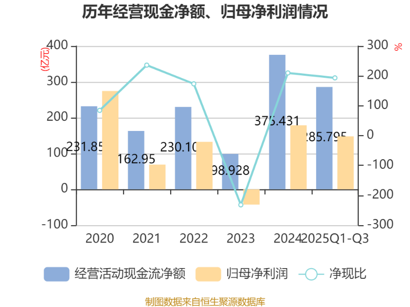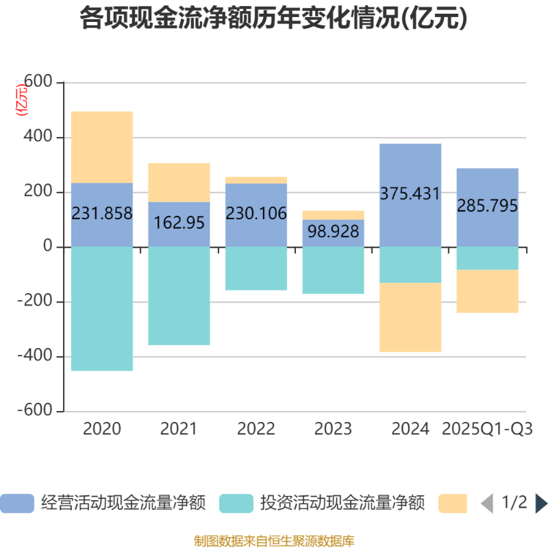 2025年前三季度,公司经营活动现金流净额为285.8亿元,同比下降2.05%;筹资活动现金流净额-156.56亿元,同比减少11.16亿元;投资活动现金流净额-84.99亿元,上年同期为-126.68亿元。