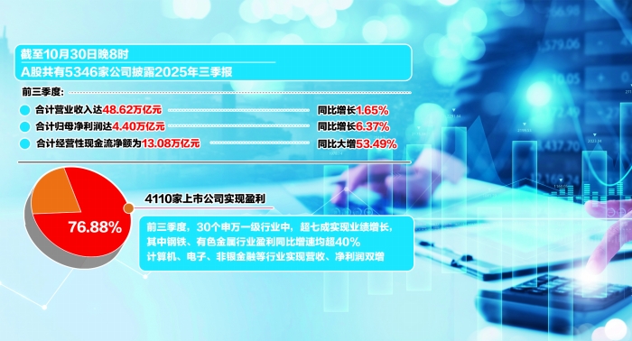 据上海证券报统计,截至10月30日晚8时,A股共有5346家公司披露2025年三季报。今年前三季度,5346家公司合计营业收入达48.62万亿元,同比增长1.65%;合计归母净利润达4.40万亿元,同比增长6.37%;经营性现金流净额为13.08万亿元,同比大增53.49%;4110家上市公司实现盈利,占比为76.88%。分行业来看,人工智能加速渗透背景下,电子、计算机等新兴产业公司表现亮眼;受益于政策及供给端支撑,钢铁、有色金属等传统周期行业显著复苏。