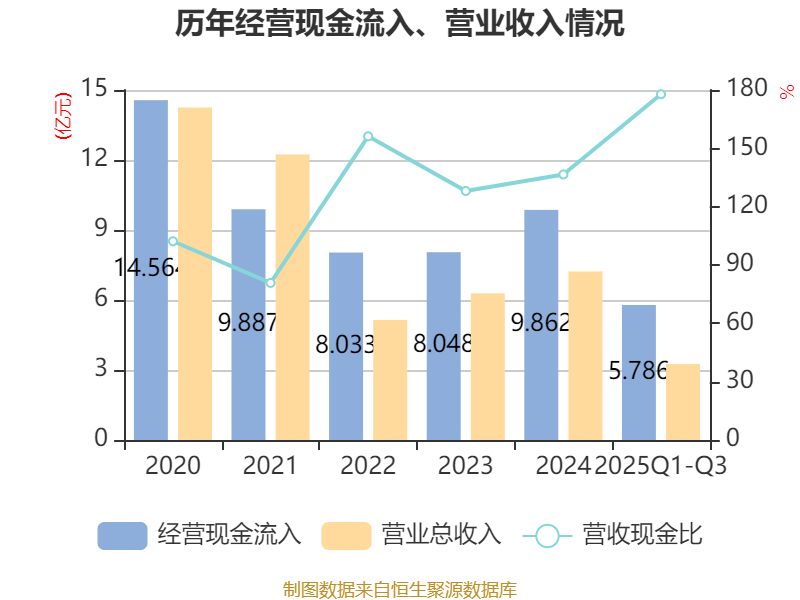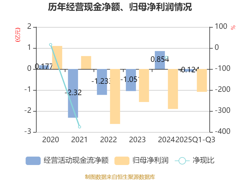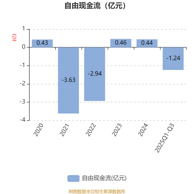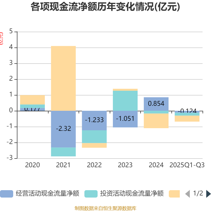 2025年前三季度,公司经营活动现金流净额为-1238.36万元,同比减少3628.79万元;筹资活动现金流净额-3758.64万元,同比增加2674.53万元;投资活动现金流净额-1850.57万元,上年同期为-1514.94万元。