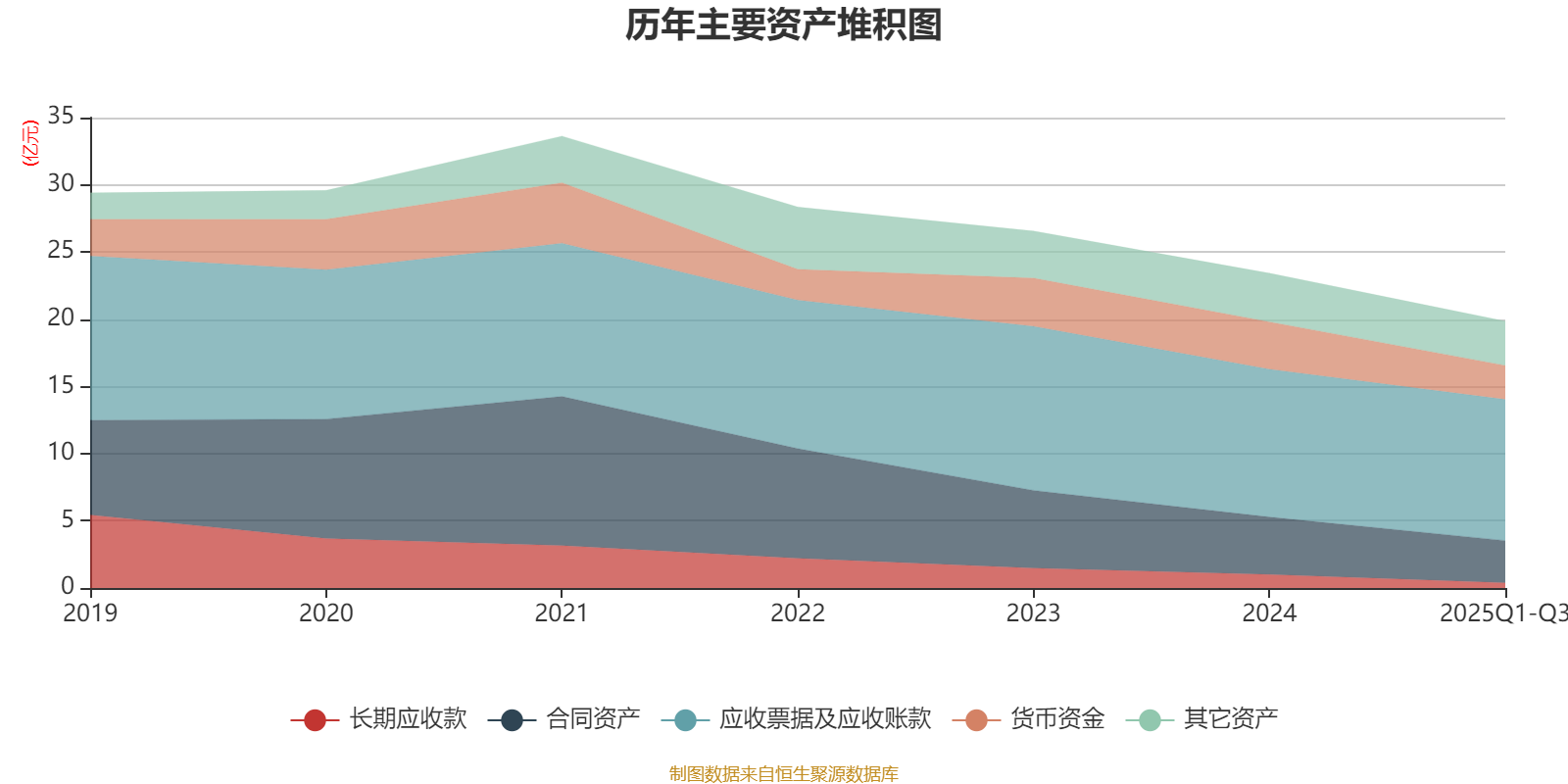 资产重大变化方面,截至2025年三季度末,公司应收票据及应收账款较上年末减少4.53%,占公司总资产比重上升5.93个百分点;合同资产较上年末减少26.66%,占公司总资产比重下降2.46个百分点;一年内到期的非流动资产较上年末减少56.27%,占公司总资产比重下降2.36个百分点;长期应收款较上年末减少61.13%,占公司总资产比重下降2.33个百分点。