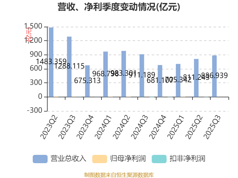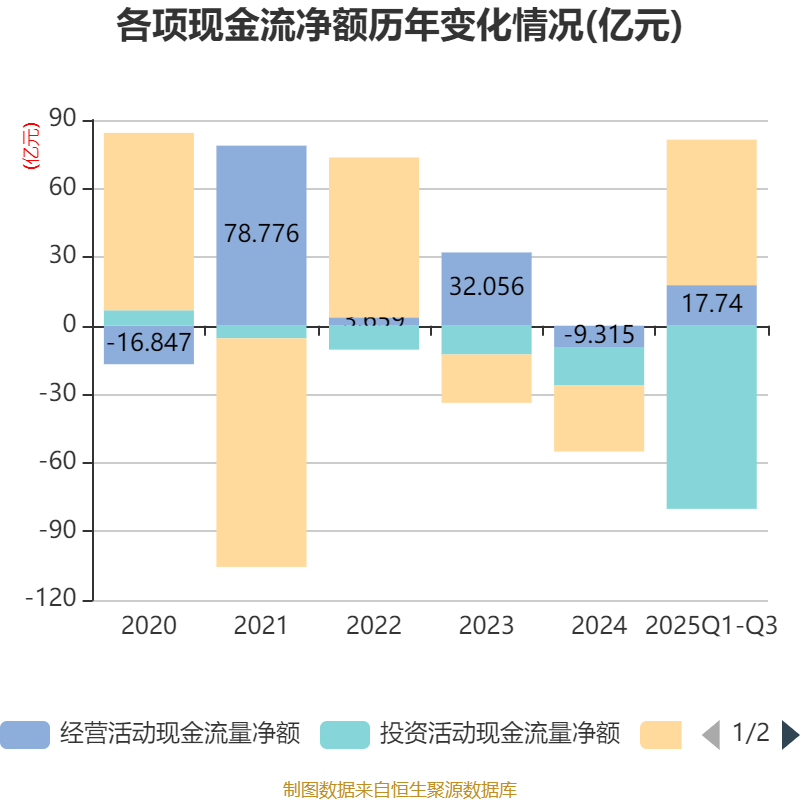 2025年前三季度,公司经营活动现金流净额为17.74亿元,同比增长5.1%;筹资活动现金流净额63.67亿元,同比增加15.92亿元;投资活动现金流净额-80.12亿元,上年同期为-81.69亿元。