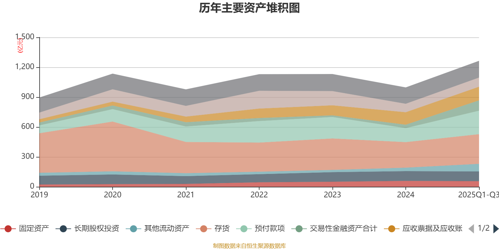 资产重大变化方面,截至2025年三季度末,公司交易性金融资产合计较上年末增加203.68%,占公司总资产比重上升4.77个百分点;预付款项较上年末增加67.22%,占公司总资产比重上升4.51个百分点;无形资产较上年末减少88.63%,占公司总资产比重下降3.1个百分点;其他流动资产较上年末增加122.35%,占公司总资产比重上升2.61个百分点。