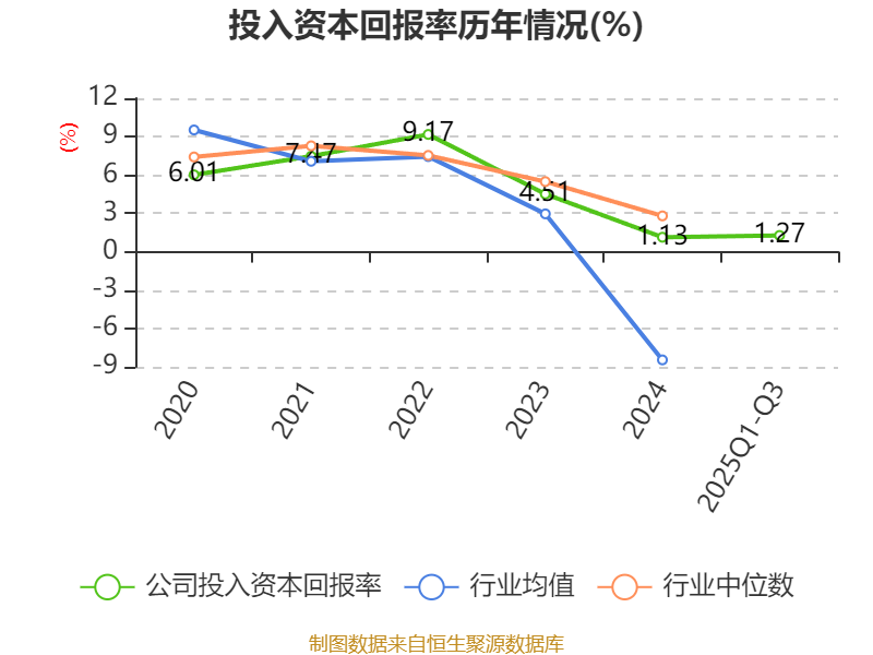 盈利能力方面, 2025年前三季度公司加权平均净资产收益率为1.11%,同比下降0.31个百分点。公司2025年前三季度投入资本回报率为1.27%,较上年同期下降0.98个百分点。