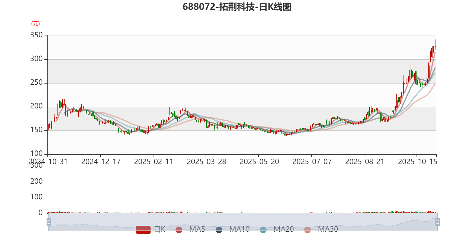 以10月30日收盘价计算,拓荆科技目前市盈率(TTM)约为94.38倍,市净率(LF)约15.07倍,市销率(TTM)约15.2倍。
