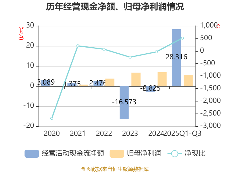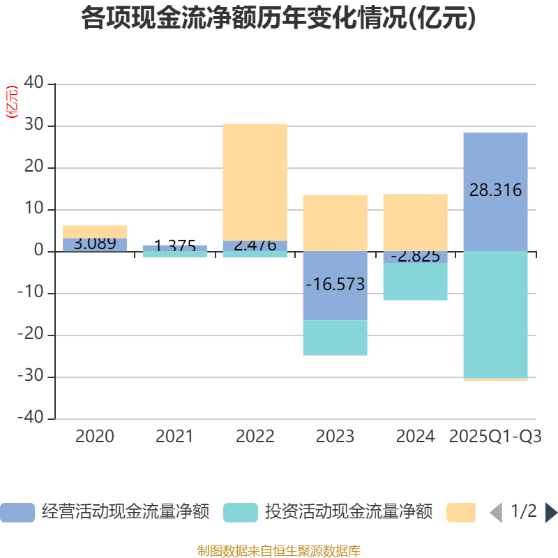 2025年前三季度,公司经营活动现金流净额为28.32亿元,同比增加38.31亿元;筹资活动现金流净额-5485.97万元,同比减少7.95亿元;投资活动现金流净额-30.45亿元,上年同期为-7.26亿元。