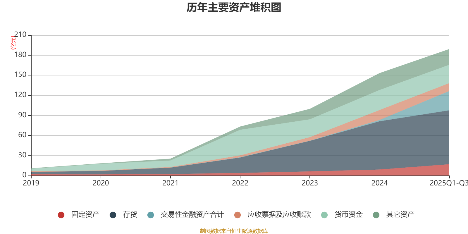 资产重大变化方面,截至2025年三季度末,公司交易性金融资产合计较上年末增加1389.37%,占公司总资产比重上升13.97个百分点;货币资金较上年末减少8.66%,占公司总资产比重下降5.1个百分点;存货较上年末增加11.82%,占公司总资产比重下降4.44个百分点;在建工程合计较上年末减少69.58%,占公司总资产比重下降3.59个百分点。