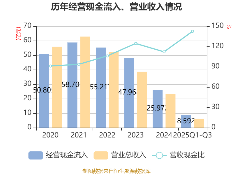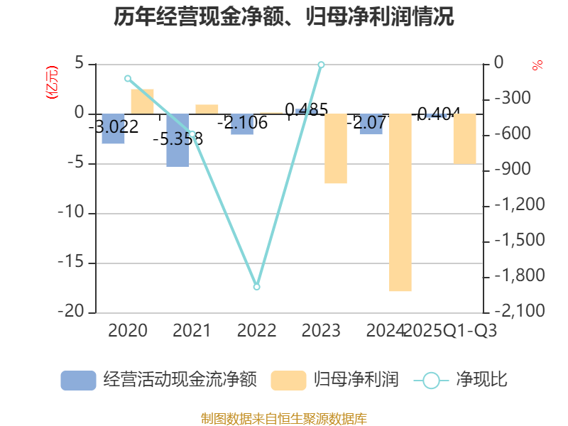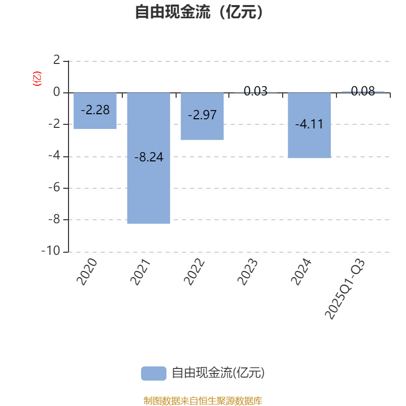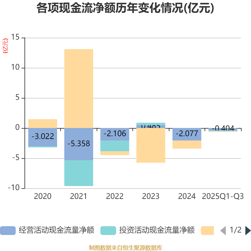 2025年前三季度,公司经营活动现金流净额为-4042.9万元,同比增加1.99亿元;筹资活动现金流净额-1063.45万元,同比增加1.15亿元;投资活动现金流净额-1270万元,上年同期为-219.17万元。