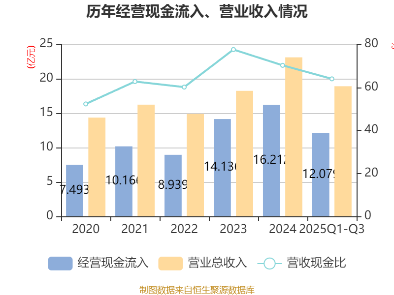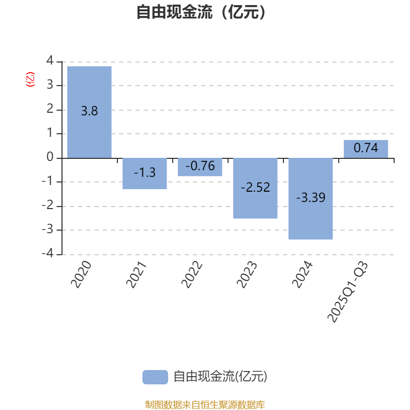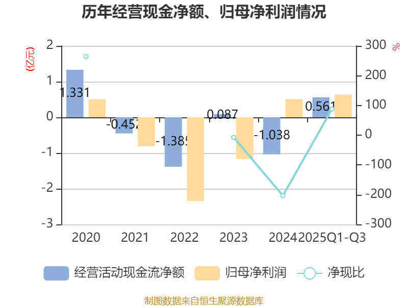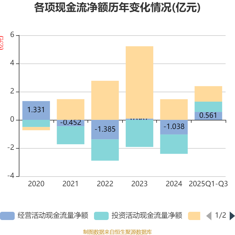 2025年前三季度,公司经营活动现金流净额为5607.69万元,同比增加1.95亿元;筹资活动现金流净额1.1亿元,同比增加8957.2万元;投资活动现金流净额7307.93万元,上年同期为-1.67亿元。