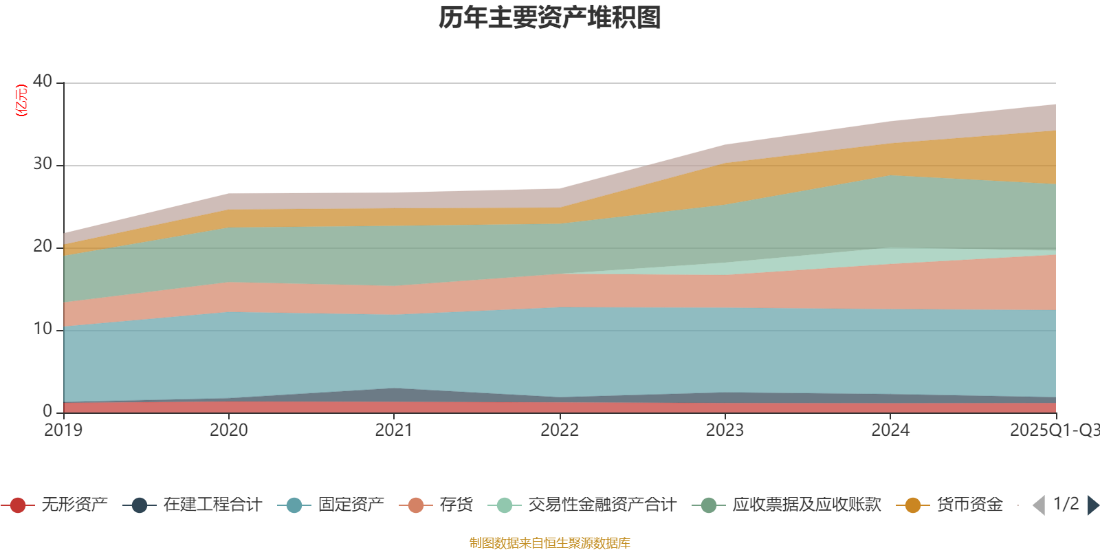 资产重大变化方面,截至2025年三季度末,公司货币资金较上年末增加67.5%,占公司总资产比重上升6.4个百分点;交易性金融资产合计较上年末减少74.93%,占公司总资产比重下降4.34个百分点;应收票据及应收账款较上年末减少7.99%,占公司总资产比重下降3.24个百分点;存货较上年末增加22.89%,占公司总资产比重上升2.5个百分点。