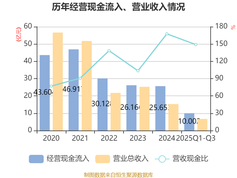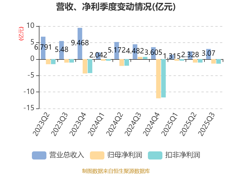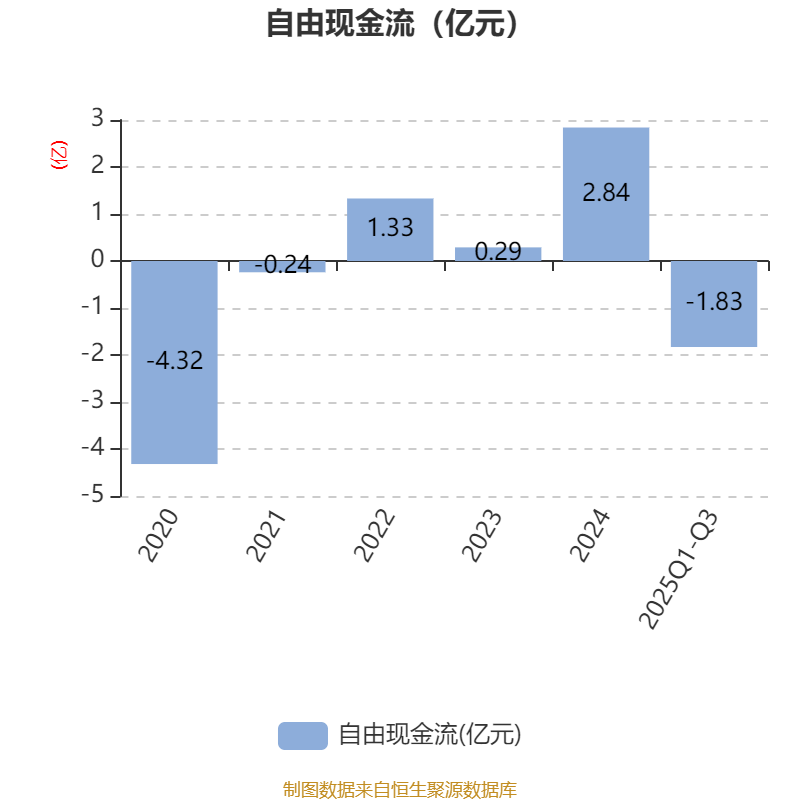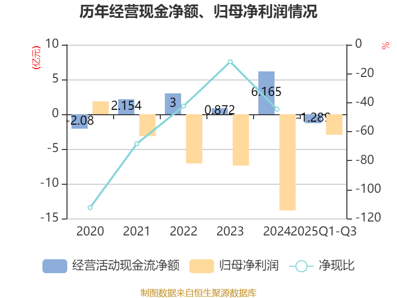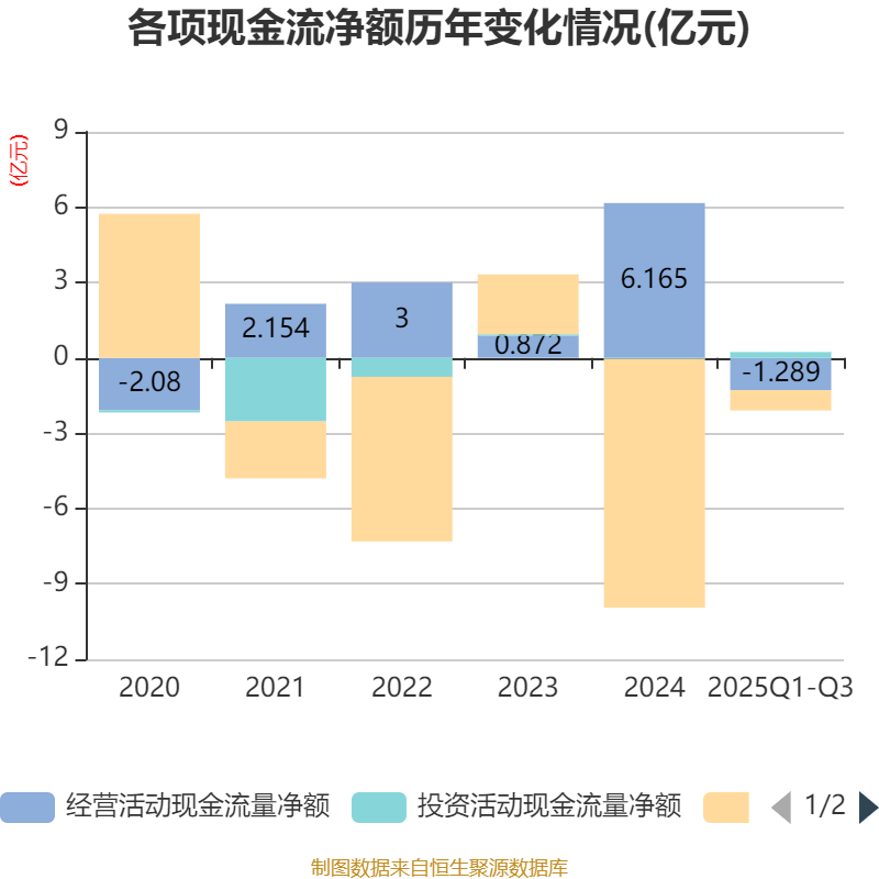 2025年前三季度,公司经营活动现金流净额为-1.29亿元,同比减少6.2亿元;筹资活动现金流净额-8062.37万元,同比增加7.94亿元;投资活动现金流净额2336.07万元,上年同期为305.79万元。