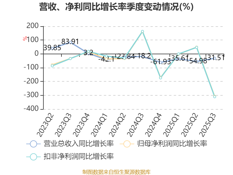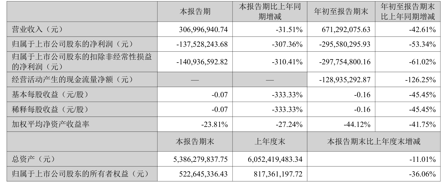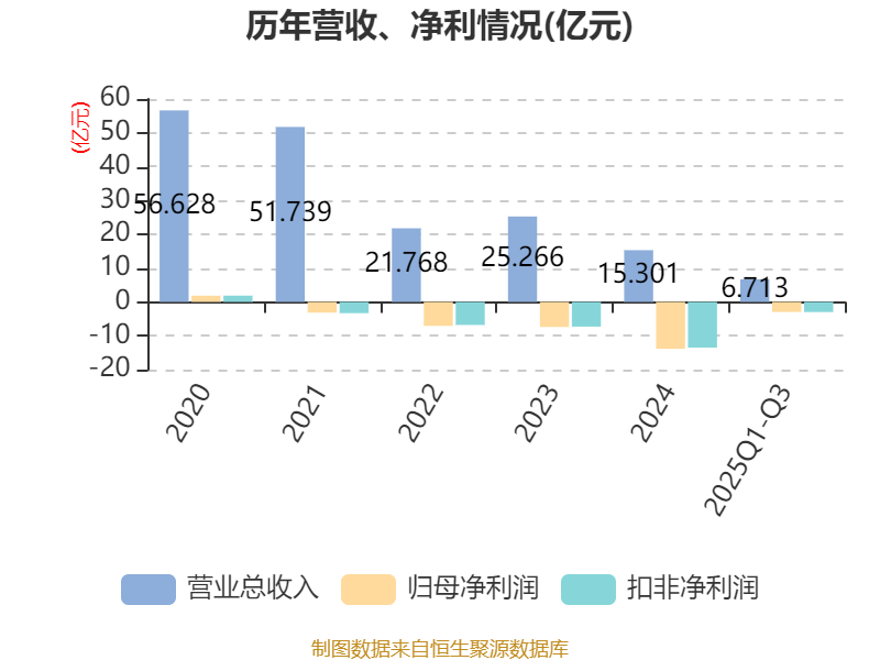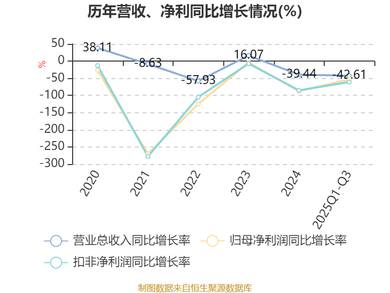中证智能财讯中化岩土(002542)10月31日披露2025年第三季度报告。前三季度公司实现营业总收入6.71亿元,同比下降42.61%;归母净利润亏损2.96亿元,上年同期亏损1.93亿元;扣非净利润亏损2.98亿元,上年同期亏损1.85亿元;经营活动产生的现金流量净额为-1.29亿元,上年同期为4.91亿元;报告期内,中化岩土基本每股收益为-0.16元,加权平均净资产收益率为-44.12%。