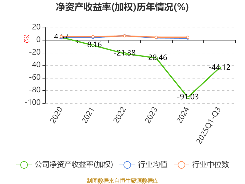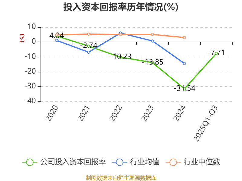 盈利能力方面, 2025年前三季度公司加权平均净资产收益率为-44.12%,同比下降35.13个百分点。公司2025年前三季度投入资本回报率为-7.71%,较上年同期下降4.98个百分点。