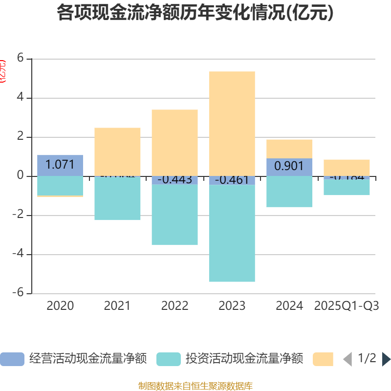 2025年前三季度,公司经营活动现金流净额为-1835.62万元,同比增加921.56万元;筹资活动现金流净额8329.44万元,同比减少6716.47万元;投资活动现金流净额-7931.01万元,上年同期为-1.1亿元。
