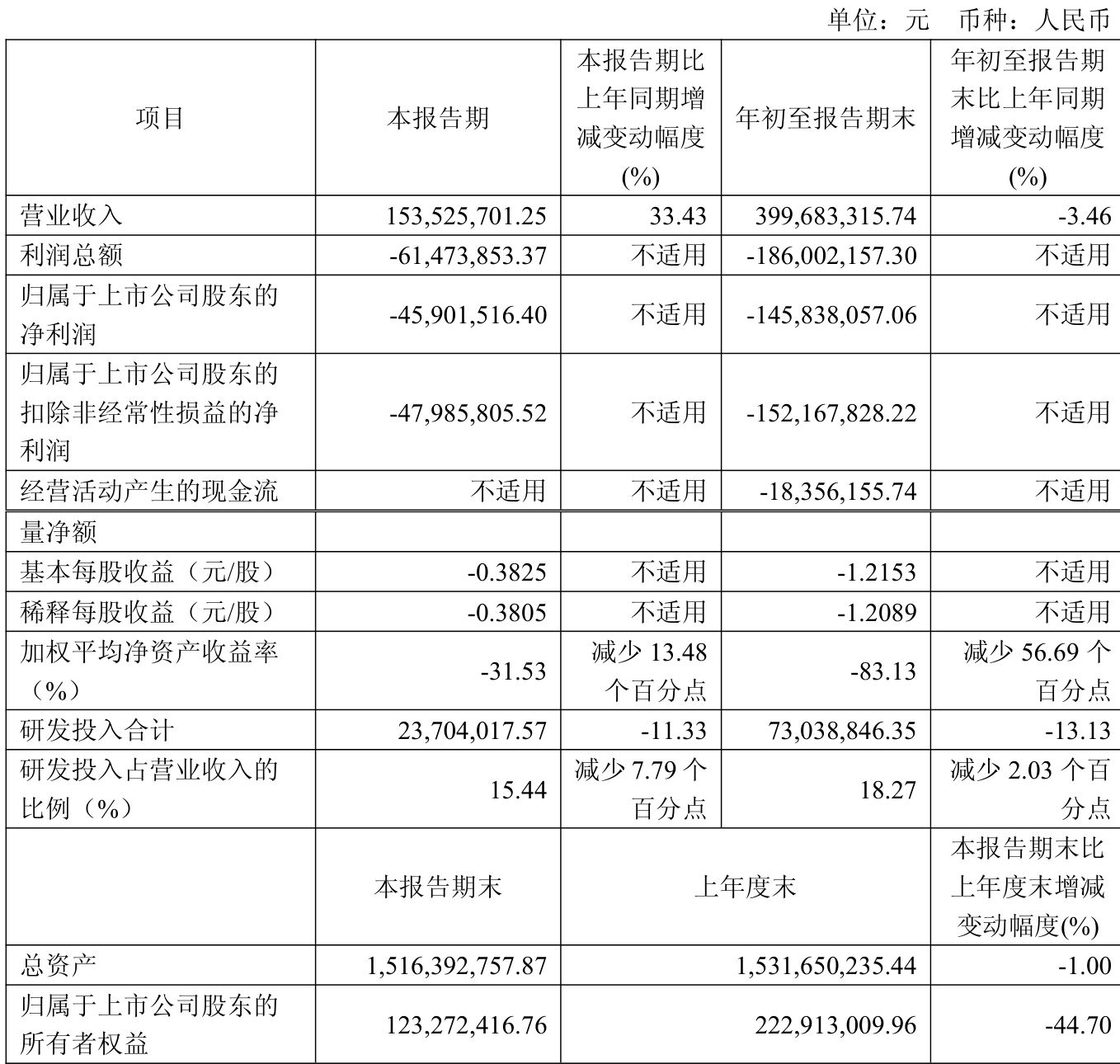 中证智能财讯昀冢科技(688260)10月31日披露2025年第三季度报告。前三季度公司实现营业总收入4亿元,同比下降3.46%;归母净利润亏损1.46亿元,上年同期亏损7971.77万元;扣非净利润亏损1.52亿元,上年同期亏损1.38亿元;经营活动产生的现金流量净额为-1835.62万元,上年同期为-2757.18万元;报告期内,昀冢科技基本每股收益为-1.2153元,加权平均净资产收益率为-83.13%。