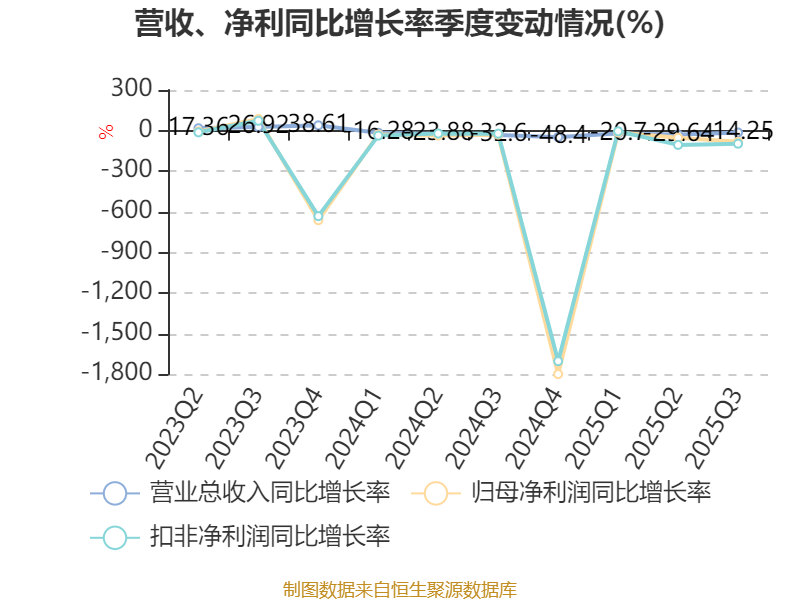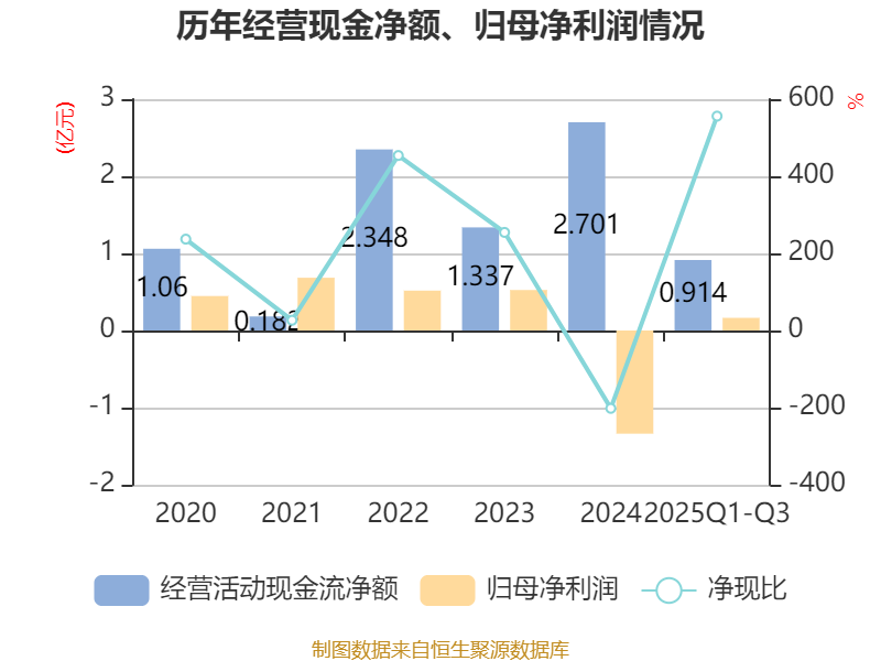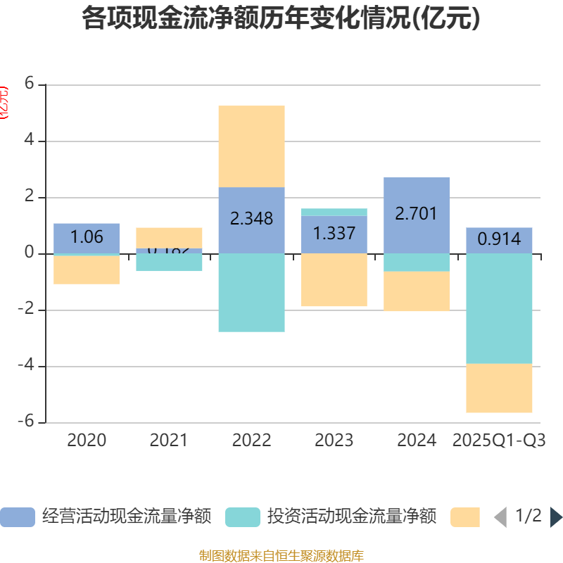 2025年前三季度,公司经营活动现金流净额为9140.42万元,同比下降24.12%;筹资活动现金流净额-1.74亿元,同比减少7177.76万元;投资活动现金流净额-3.92亿元,上年同期为3696.68万元。