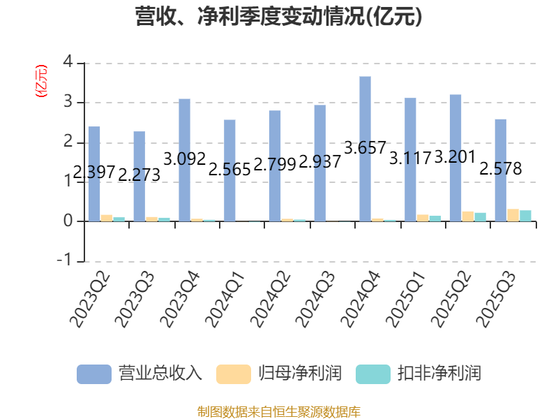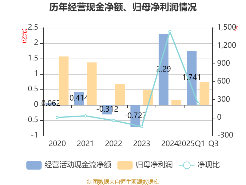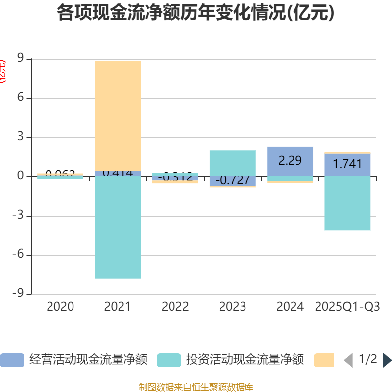 2025年前三季度,公司经营活动现金流净额为1.74亿元,同比增长26.7%;筹资活动现金流净额949.35万元,同比增加2546.56万元;投资活动现金流净额-4.13亿元,上年同期为3919.46万元。