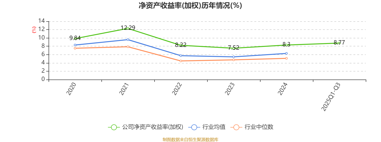 盈利能力方面, 2025年前三季度公司加权平均净资产收益率为8.77%,同比上升2.97个百分点。