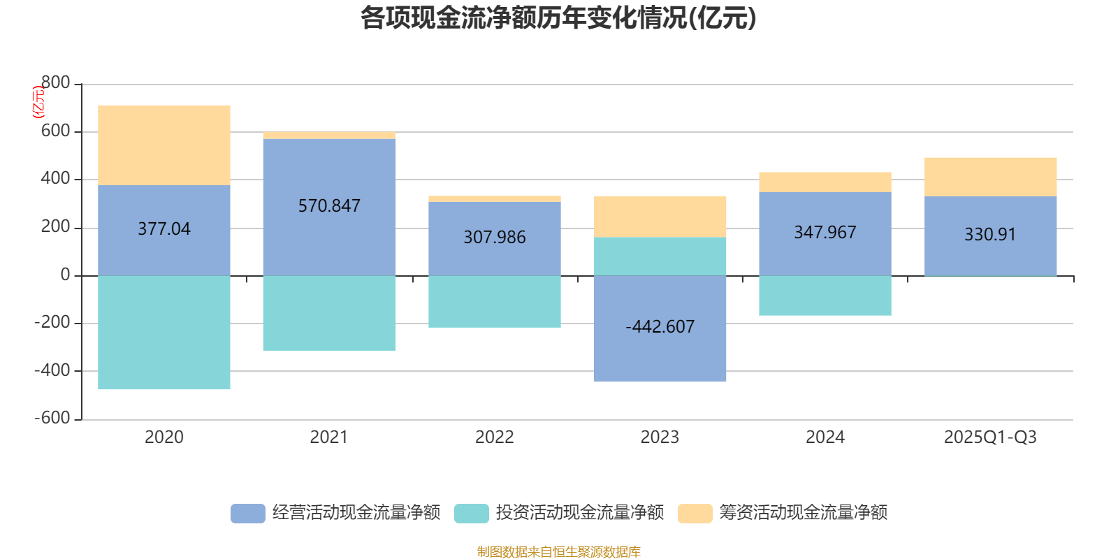 2025年前三季度,公司经营活动现金流净额为330.91亿元,同比下降43%;筹资活动现金流净额160.86亿元,同比增加365.18亿元;投资活动现金流净额-3.82亿元,上年同期为-33.27亿元。