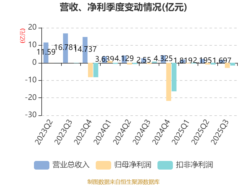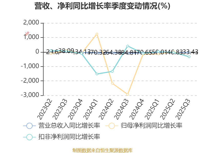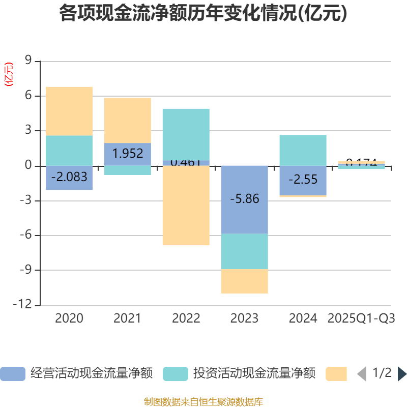 2025年前三季度,公司经营活动现金流净额为1744.13万元,同比增加3.81亿元;筹资活动现金流净额2260.55万元,同比增加1196.96万元;投资活动现金流净额-2812.94万元,上年同期为2.73亿元。