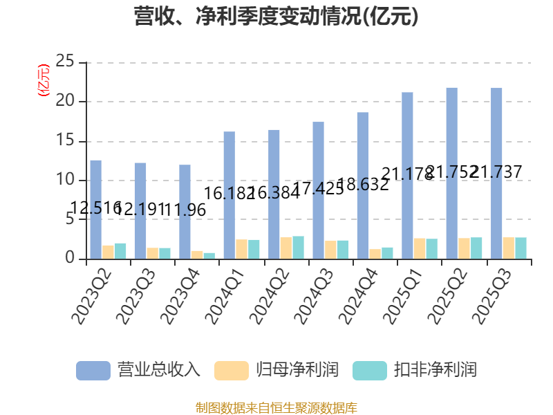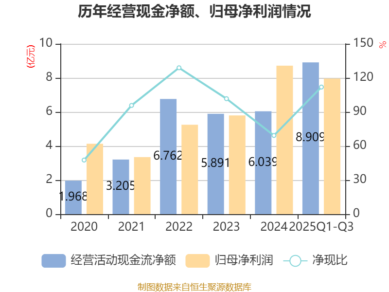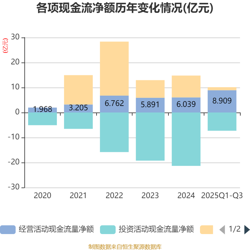 2025年前三季度,公司经营活动现金流净额为8.91亿元,同比增长226.89%;筹资活动现金流净额1.21亿元,同比减少8.67亿元;投资活动现金流净额-7.29亿元,上年同期为-15.27亿元。