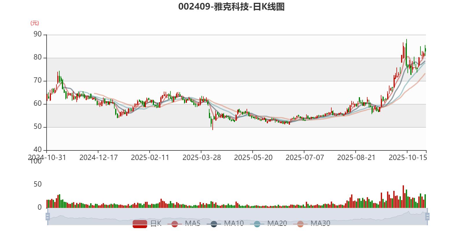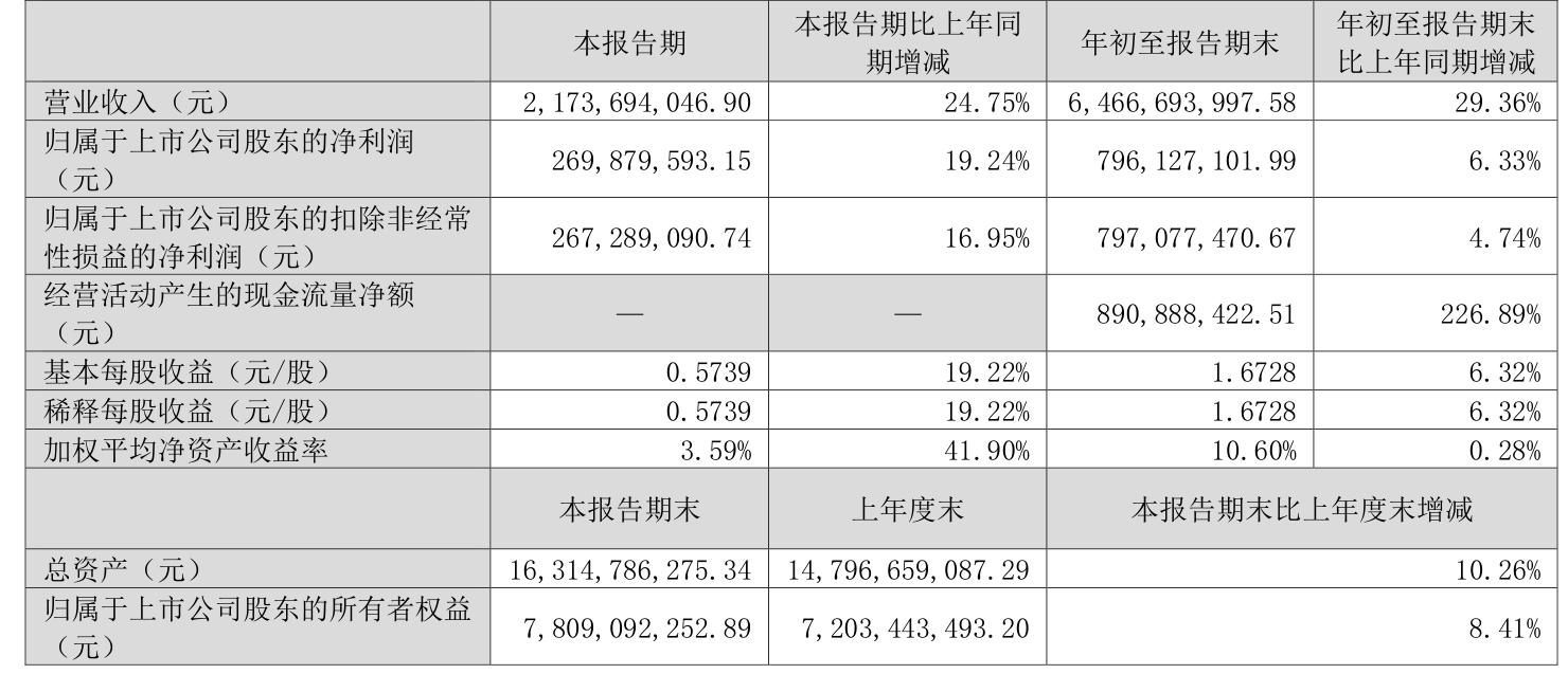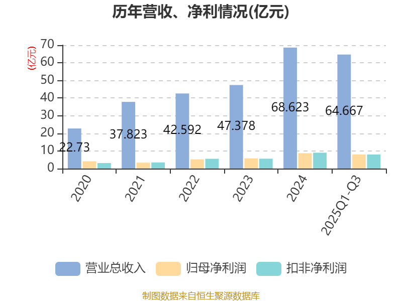 中证智能财讯雅克科技(002409)10月31日披露2025年第三季度报告。前三季度公司实现营业总收入64.67亿元,同比增长29.36%;归母净利润7.96亿元,同比增长6.33%;扣非净利润7.97亿元,同比增长5.19%;经营活动产生的现金流量净额为8.91亿元,同比增长226.89%;报告期内,雅克科技基本每股收益为1.6728元,加权平均净资产收益率为10.60%。