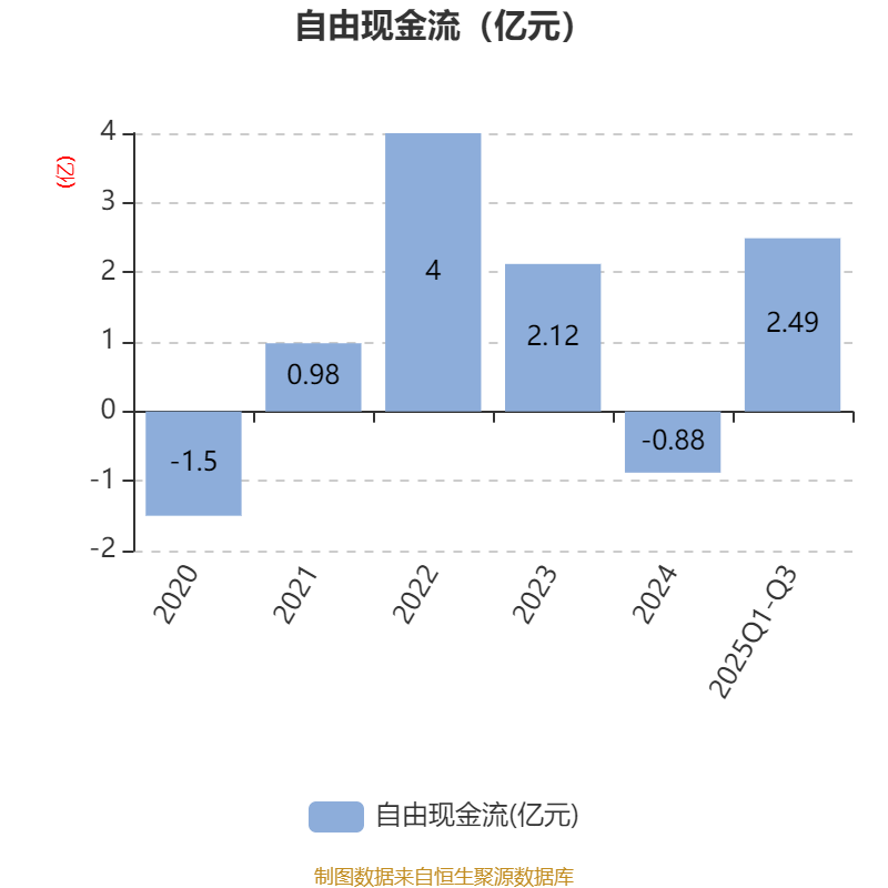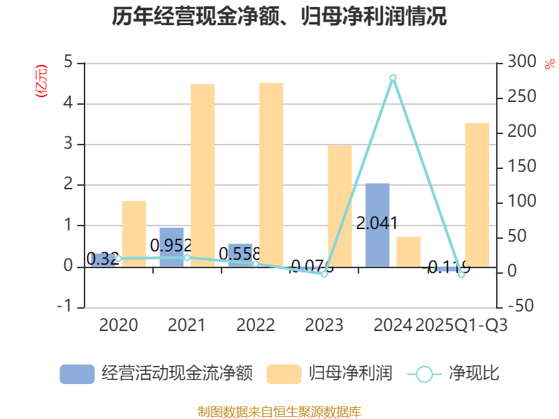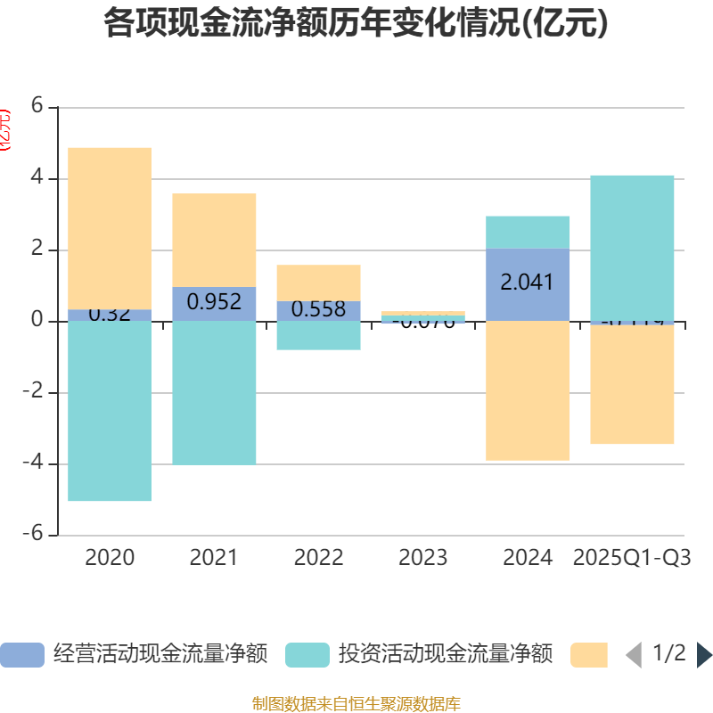 2025年前三季度,公司经营活动现金流净额为-1194.93万元,同比减少1.56亿元;筹资活动现金流净额-3.33亿元,同比减少1.94亿元;投资活动现金流净额4.08亿元,上年同期为2791.76万元。