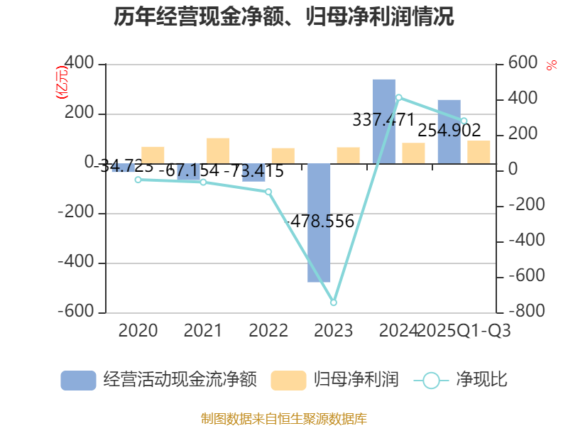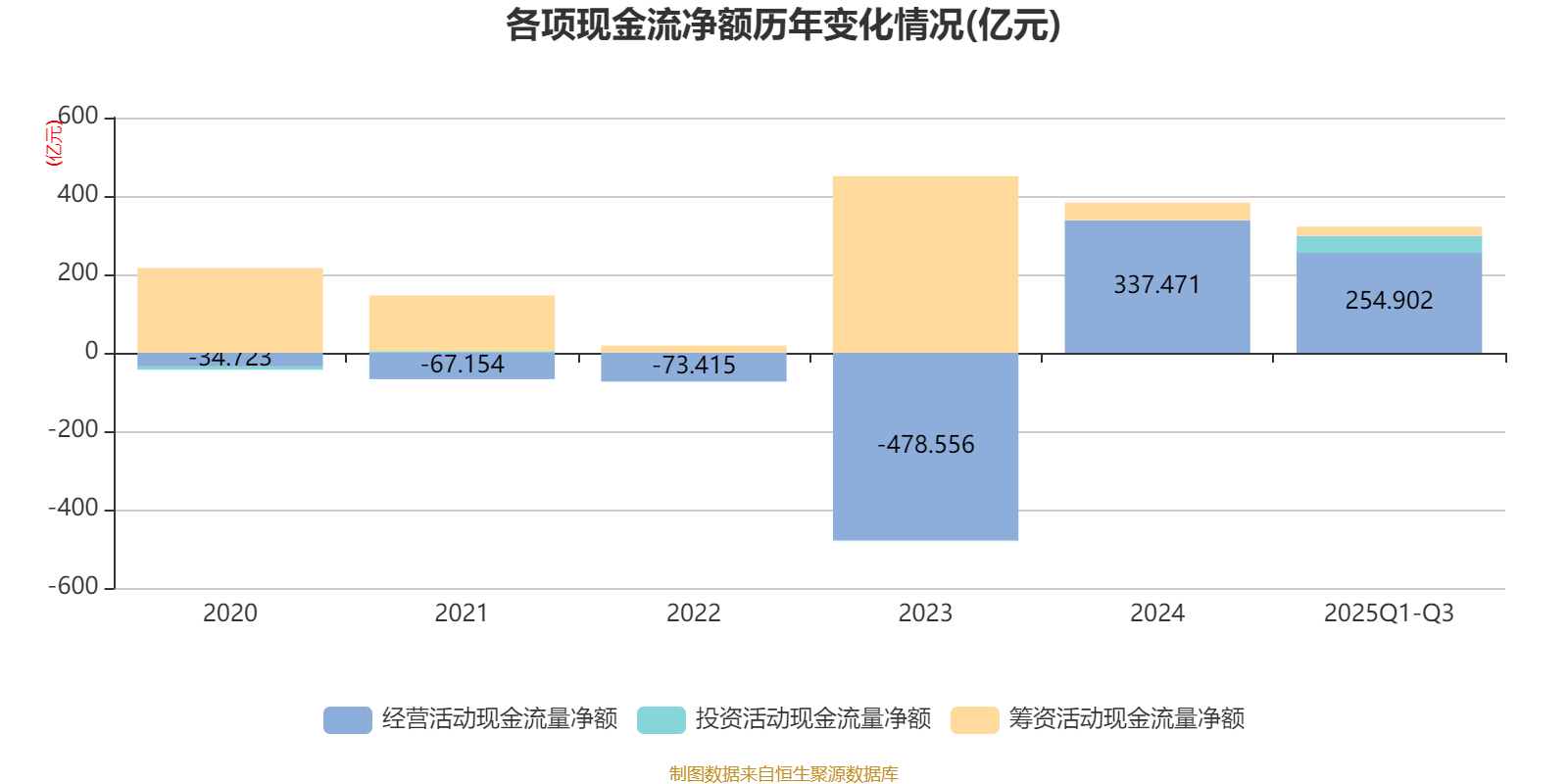 2025年前三季度,公司经营活动现金流净额为254.9亿元,同比下降54.65%;筹资活动现金流净额23.42亿元,同比增加212.43亿元;投资活动现金流净额43.44亿元,上年同期为1.63亿元。