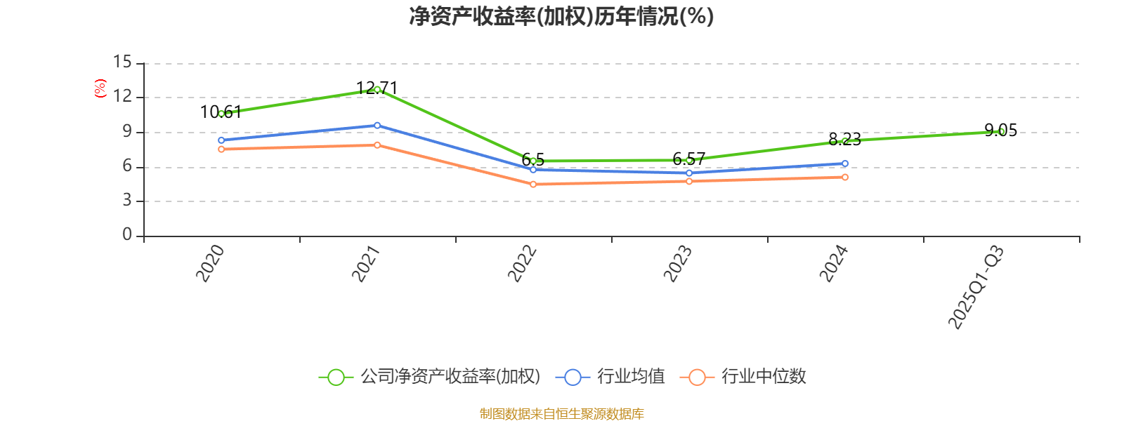 盈利能力方面, 2025年前三季度公司加权平均净资产收益率为9.05%,同比上升4.31个百分点。