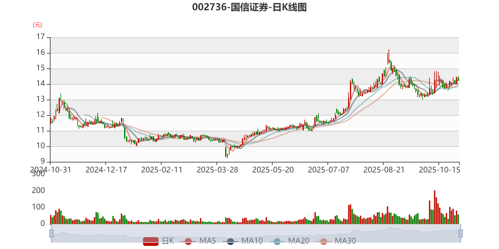 中证智能财讯国信证券(002736)10月31日披露2025年第三季度报告。前三季度公司实现营业总收入192.03亿元,同比增长69.41%;归母净利润91.37亿元,同比增长87.28%;扣非净利润91.33亿元,同比增长88.02%;经营活动产生的现金流量净额为254.9亿元,同比下降54.65%;报告期内,国信证券基本每股收益为0.85元,加权平均净资产收益率为9.05%。